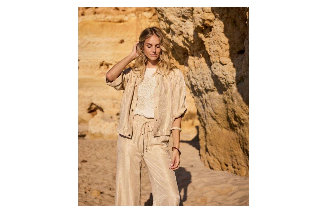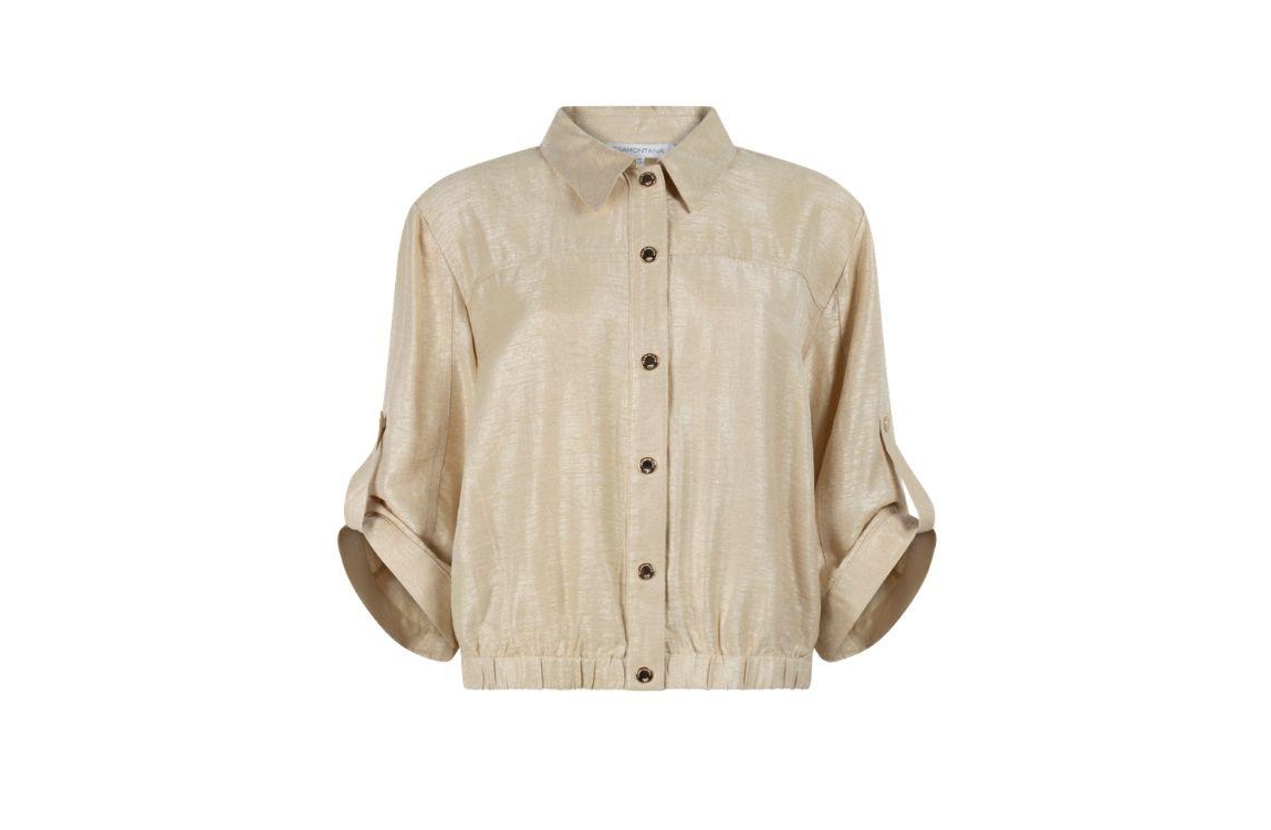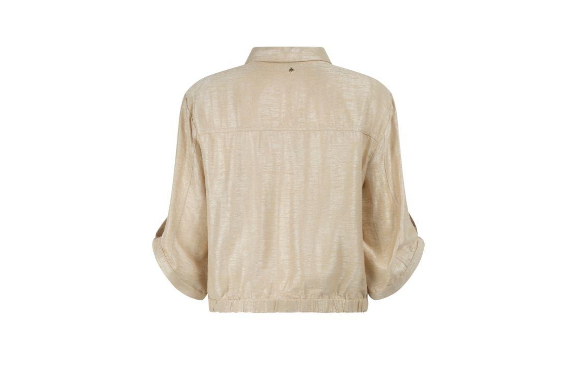 Tramontana jasje C06-20-801 1225. Dit wijdvallende model heeft een kraag en halve mouwen. Het goudkleurige jasje van Tramontana sluit aan de voorzijde door middel van knopen en is afgewerkt met een elastische zoom.