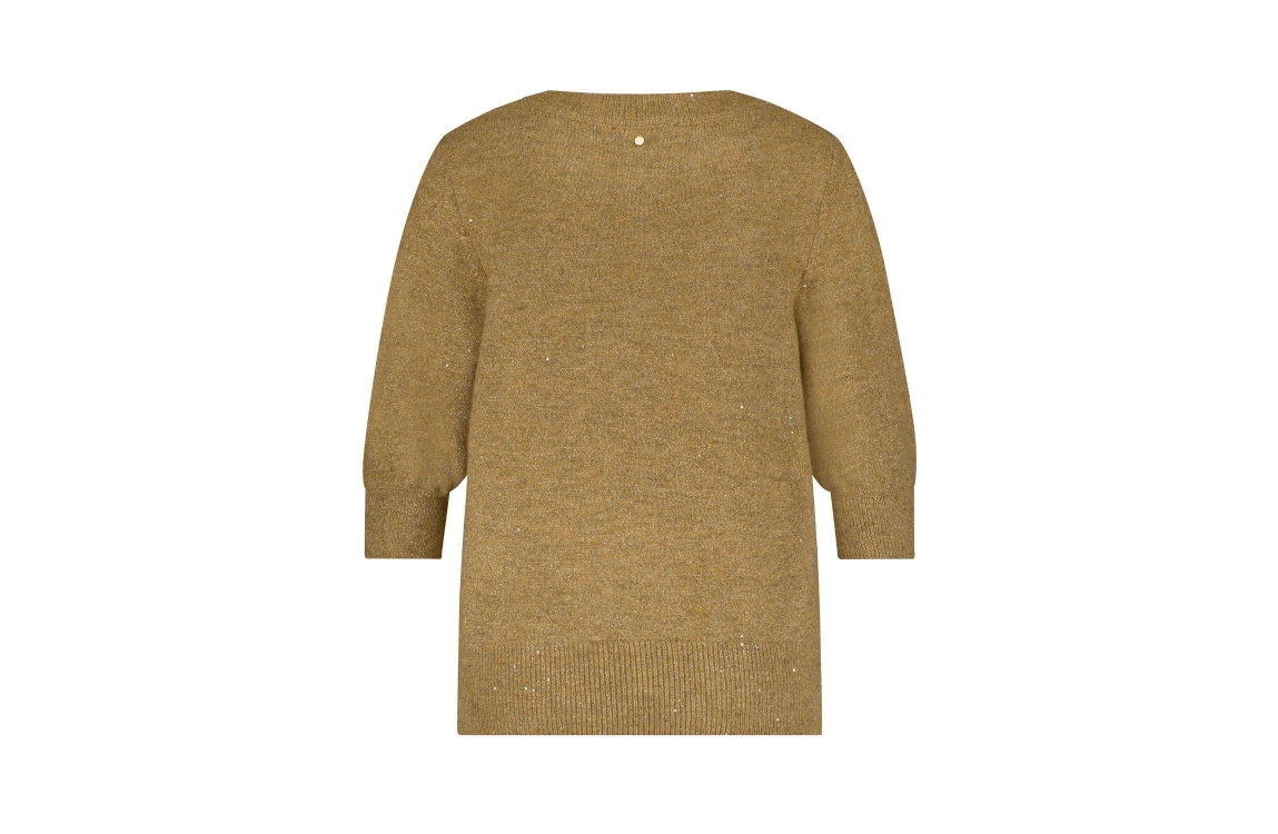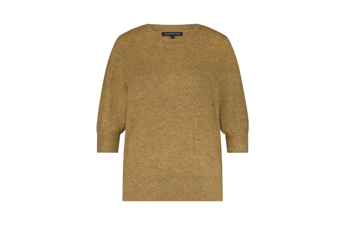 Tramontana Short-Sleeve Sequin Jumper 002801 Camle mel. Dit rechtvallende model heeft een ronde hals en korte mouwen. Deze camel kleurige top van Tramontana is afgewerkt met ribboorden en is all-over bewerkt met een lurex en glitter.