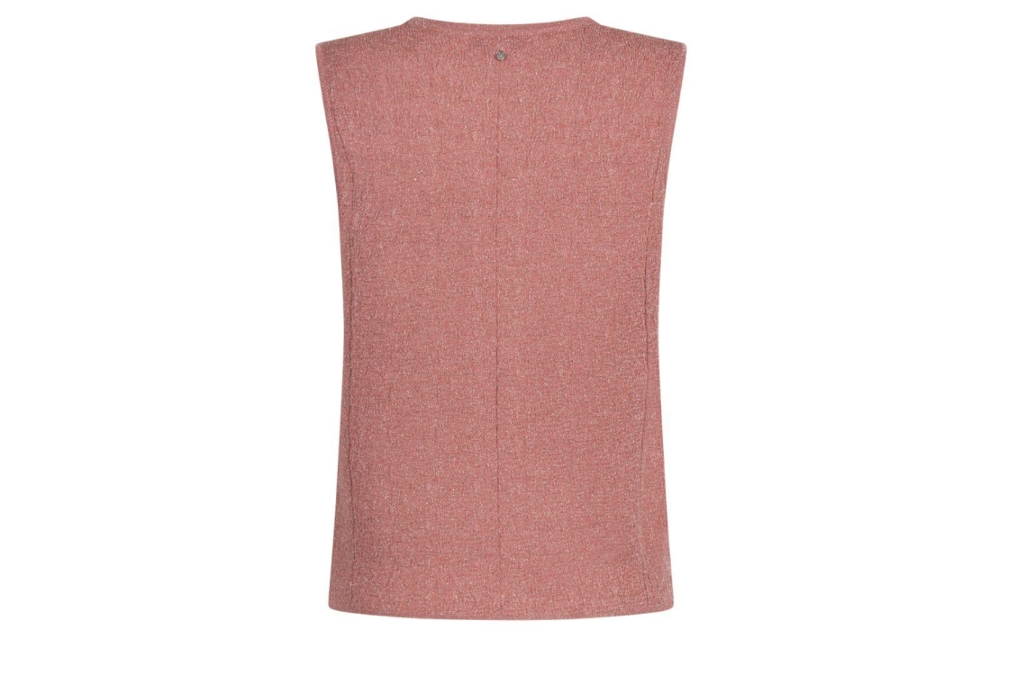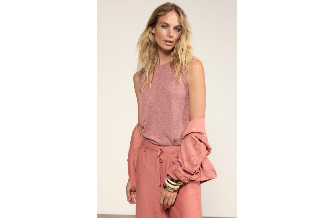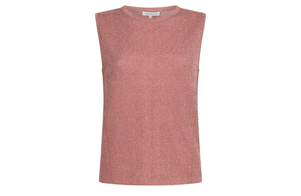 Tramontana sleeveless jumper sequins C46-20-602. Dit rechtvallend model is voorzien van een ronde hals en is mouwloos. Deze dusty roze jumper van Tramontana is all-over bewerkt met glitter.