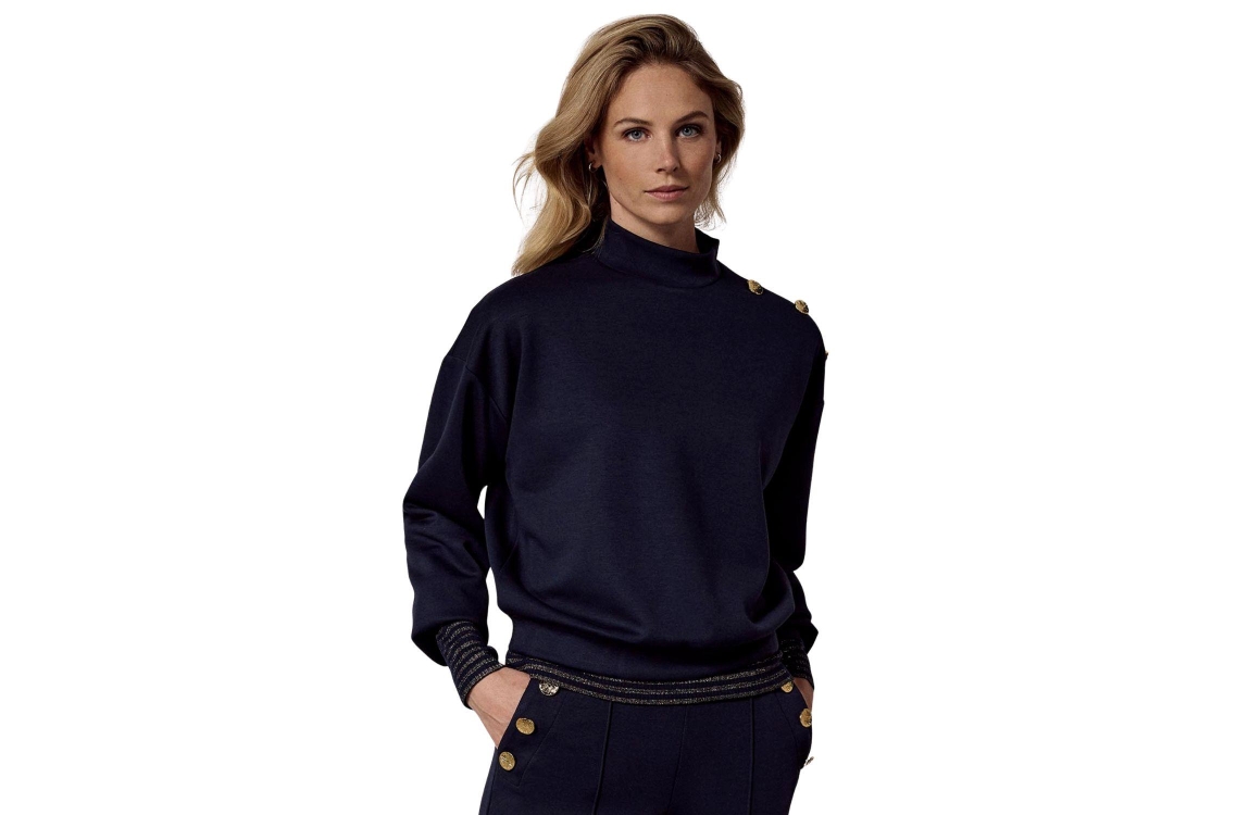 Tramontana sweater C12-18-601. Dit soepelvallende model heeft een ronde halslijn en lange mouwen. Deze donkerblauwe sweater van Tramontana is op de linkerschoudernaad gedetailleerd met goudkleurige knopen en is uitgevoerd in een stretchkwaliteit.