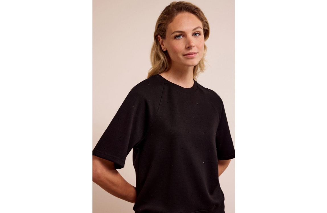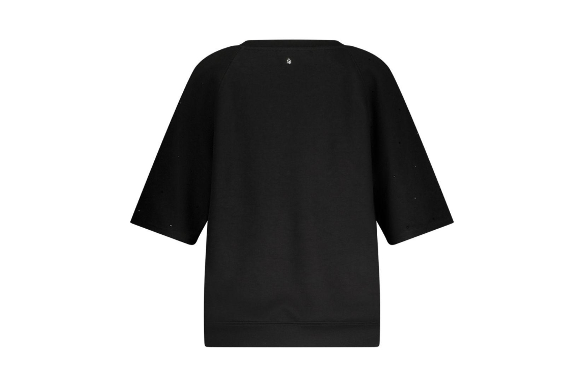 Tramontana jumper C12-17-601. Dit wijdvallend model is voorzien van een ronde hals en heeft korte mouwen. Deze zwarte jumper van Tramontana is bewerkt met strass steentjes.