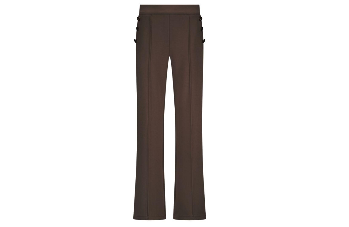 Tramontana broek C12-18-101 F. Dit wide leg model sluit door middel van een elastische boord. Deze bruine broek van Tramontana is voorzien van twee steekzakken aan de voorzijde en twee paspelzakken aan de achterzijde. Het model is gedetailleerd met goudkleurige knopen langs de zakken en is uitgevoerd in lichte stretchkwaliteit.