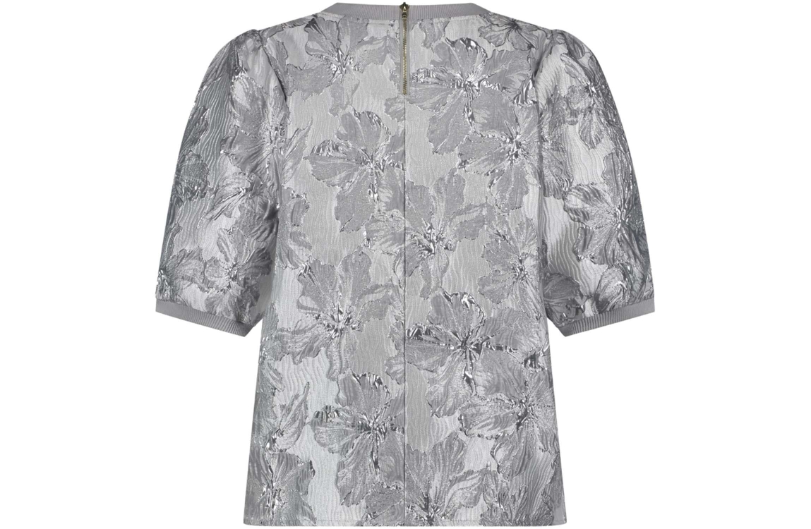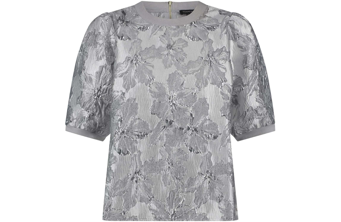 Tramontana top C27-13-401. Dit rechtvallend model is voorzien van een ronde hals en heeft korte mouwen. Deze zilverkleurige top sluit aan de achterzijde door middel van een rits en is all-over bewerkt met een bloemmotief.