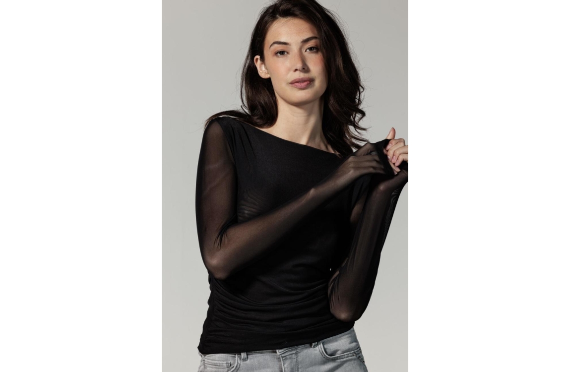 Tramontana top C-17-13-401. Dit rechtvallend model heeft een boothals en lange mouwen. Deze zwarte top van Tramontana is semi-transparant uitgevoerd en bevat lichte stretch kwaliteit.