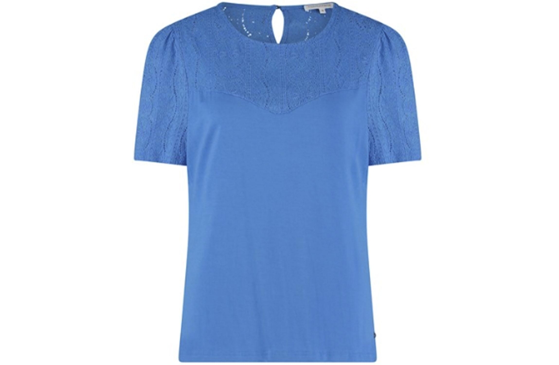 Tramontana top C22-11-404. Dit rechtvallend model heeft korte mouwen en een ronde hals. Deze blauwe top van Tramontana is aan de bovenzijde en bij de mouwen bewerkt met kant en sluit aan de achterzijde door middel van een knoopje. Dit model bevat lichte stretch.