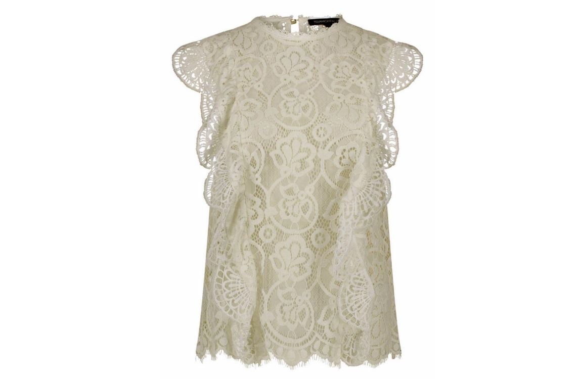 Tramontana top C08-13-401. Dit rechtvallend model is voorzien van een ronde hals en is mouwloos. Deze witte kanten top van Tramontana sluit aan de achterzijde door middel van knopen en is aan beide kanten bewerkt met ruffels.