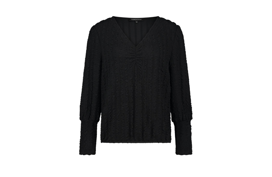 Tramontana top C24-13-401. Dit rechtvallend model heeft een V-hals en lange ballonmouwen. Deze zwarte top van Tramontana is all-over bewerkt met een streepstructuur en beschikt over een elastische onderboord.