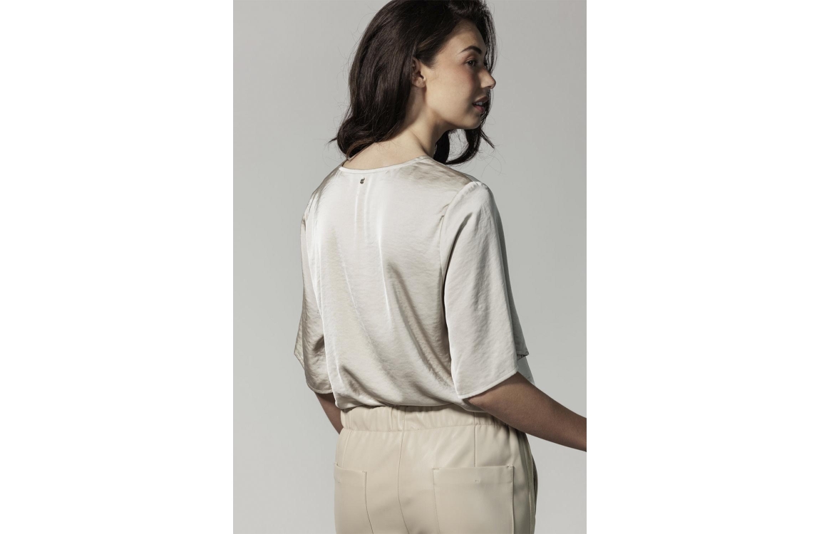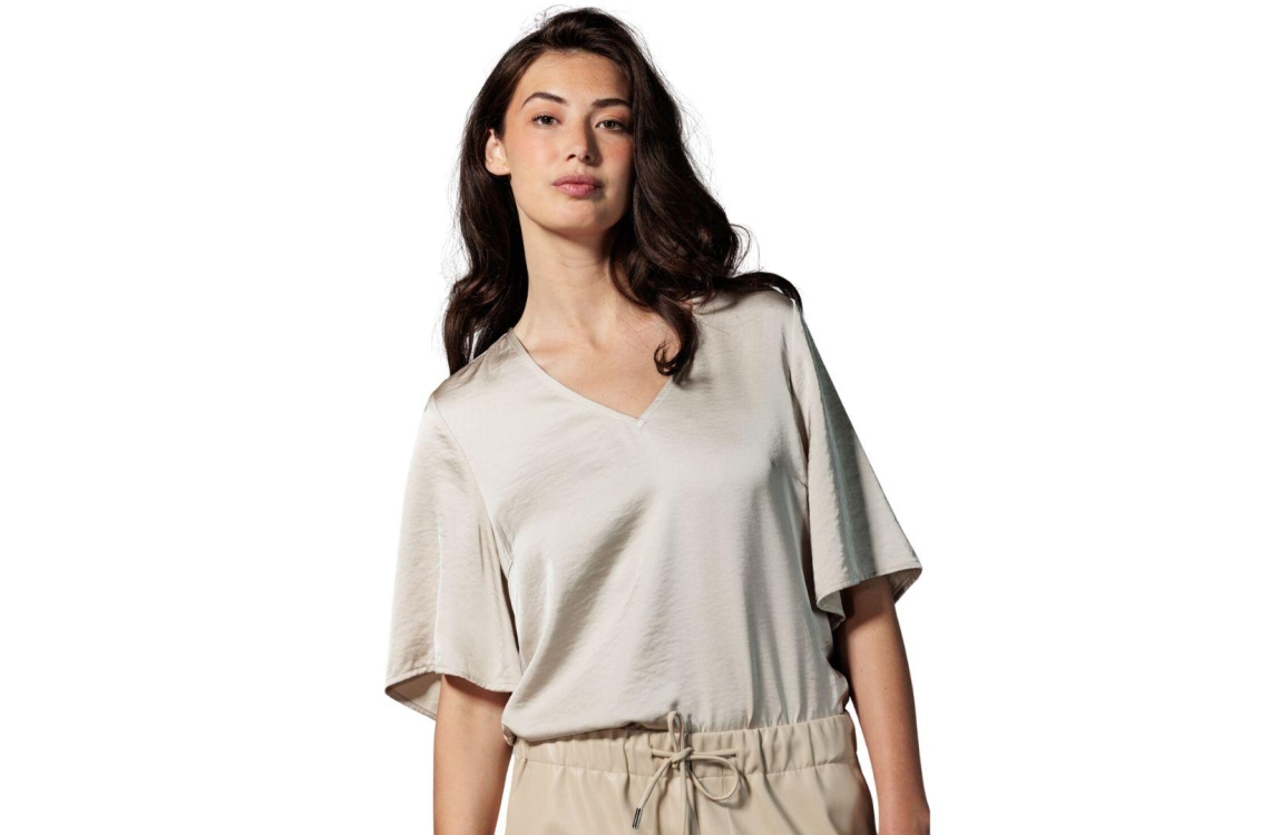 Tramontana top Hammered Satin C06-13-402. Dit wijdvallende model is voorzien van een v-hals en heeft korte mouwen. Deze kit kleurige top van Tramontana is uitgevoerd in een satijn-look kwaliteit en heeft wijde golvende mouwen.