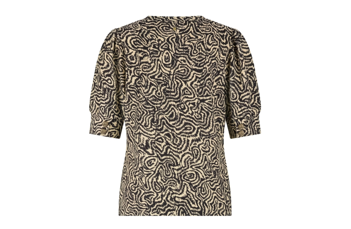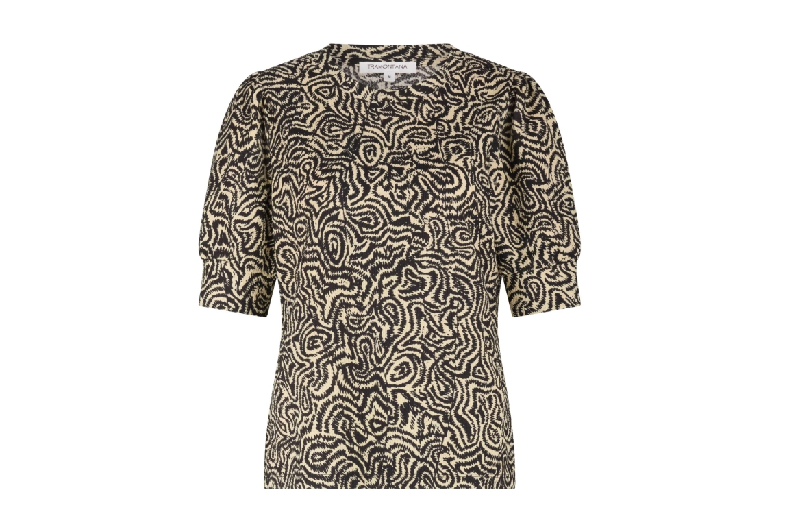Tramontana top wanderling lines D01-19-401. Dit rechtvallend model is voorzien van een ronde hals en heeft korte mouwen afgewerkt met sierlijke knoop details. Deze zwarte/beige top van Tramontana is bewerkt met een grafisch design.