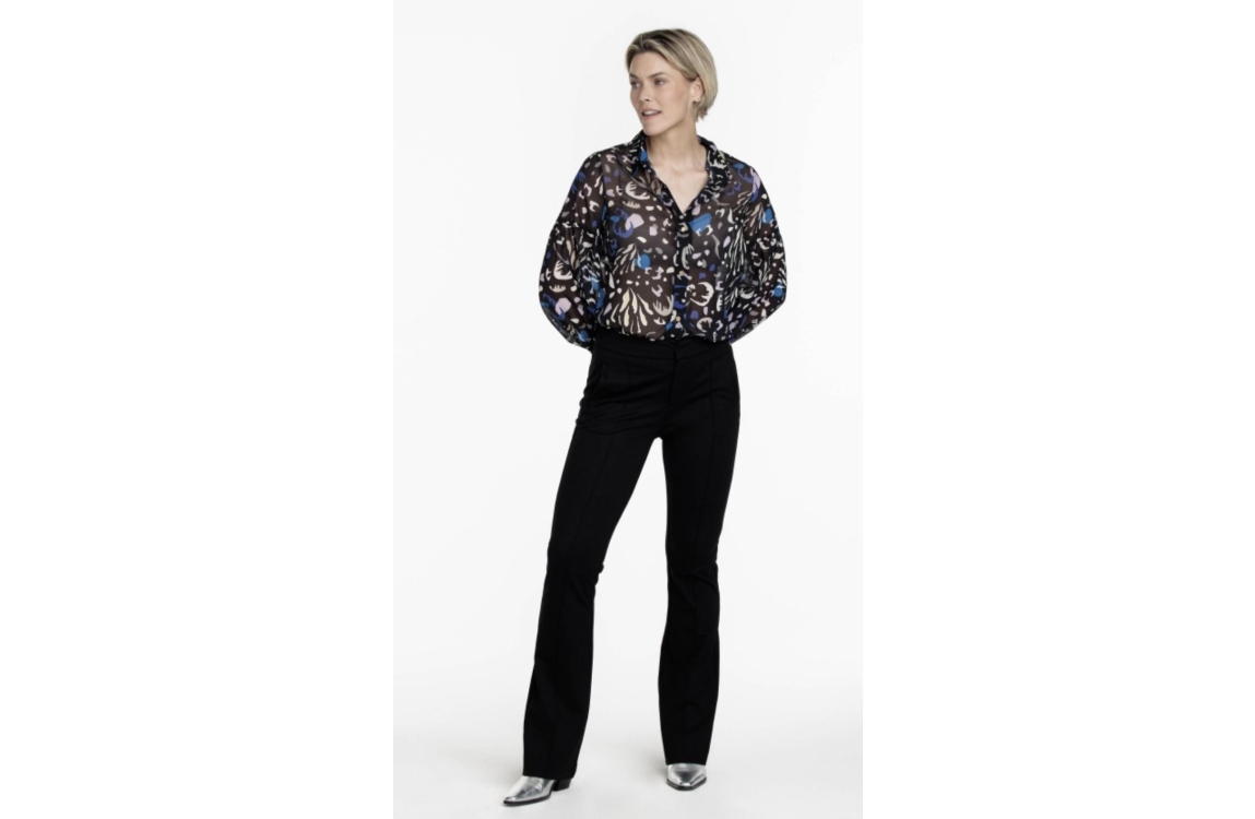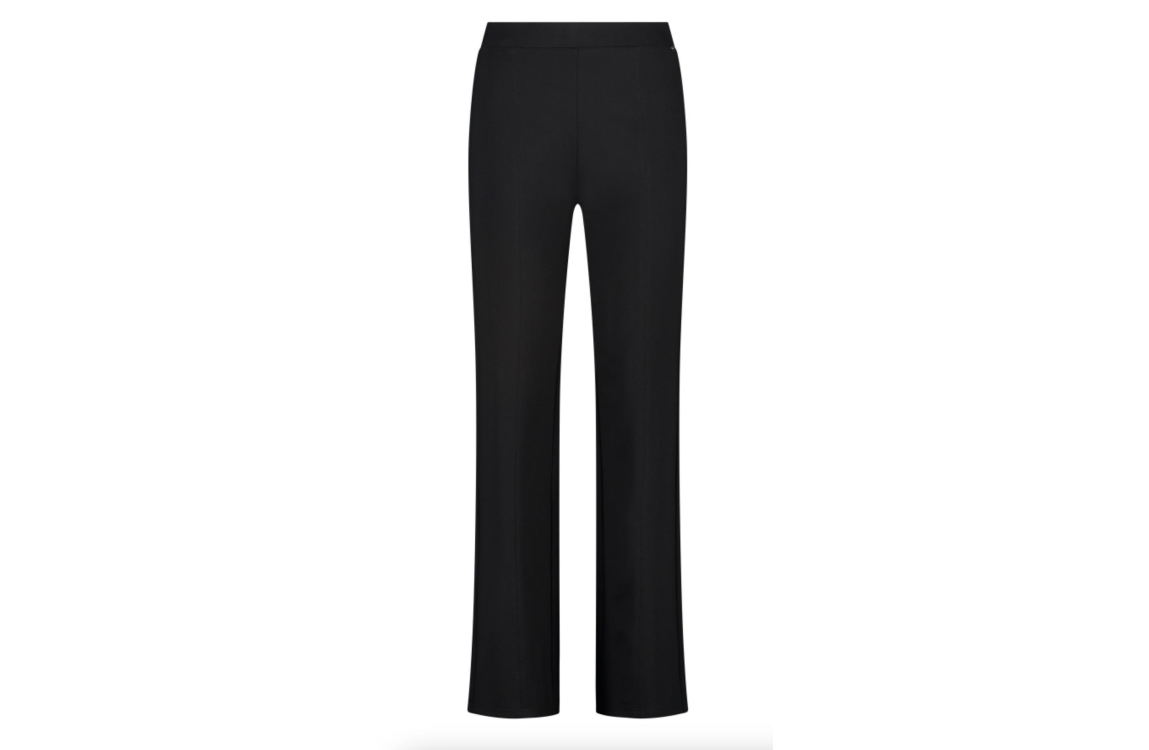 Tramontana broek Dora. Dit flared model sluit door middel van een knoop en rits en heeft lange pijpen. Deze zwarte broek van Tramontana is voorzien van twee schuine steekzakken aan de voorzijde en twee fake paspelzakken aan de achterzijde. Deze broek is afgewerkt met een gestikte naad aan de voorzijde.