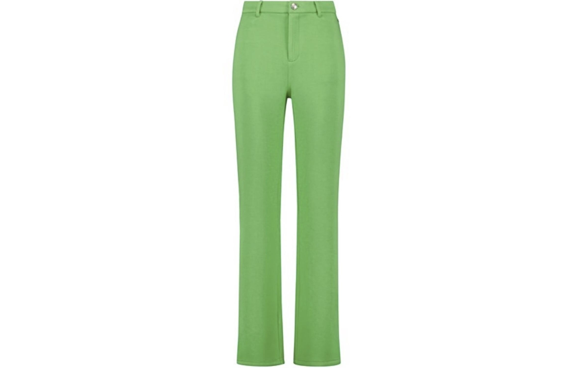 Tramontana pantalon C13-10-101. Dit straight leg model sluit door middel van een rits en een sierlijke knoop afgewerkt met ceintuurlussen. Deze groene pantalon van Tramontana is voorzien van twee steekzakken aan de voorzijde en twee decoratieve paspelzakken aan de achterzijde. Dit model is uitgevoerd in een sweat kwaliteit.