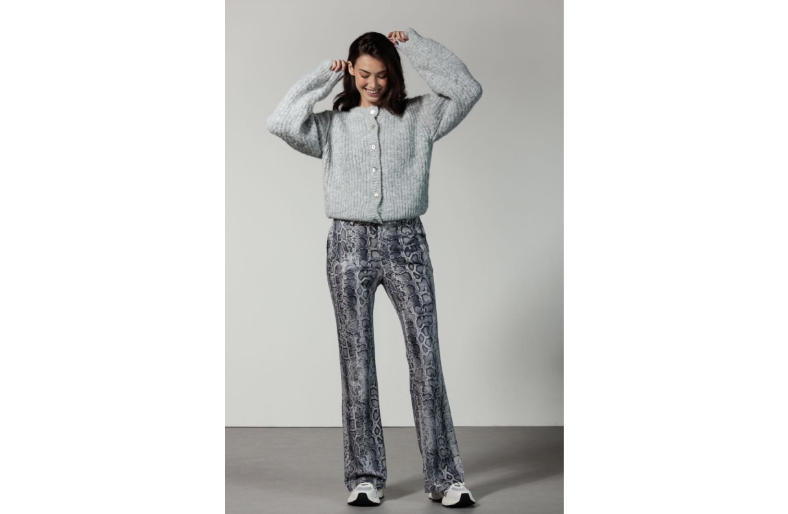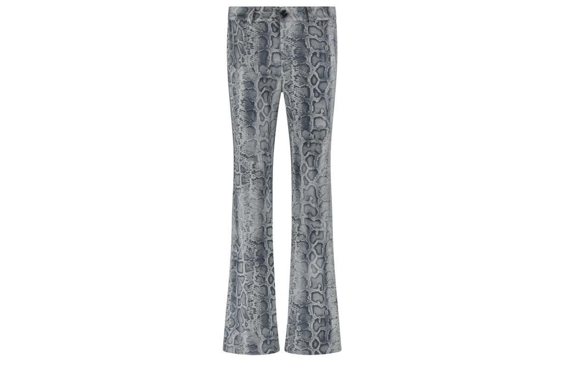 Tramontana trousers suedine grey snake. Dit flared model sluit door middel van een knoop en rits. Deze grijze broek van Tramontana is bewerkt met een slangenpatroon.