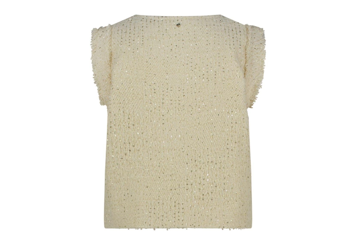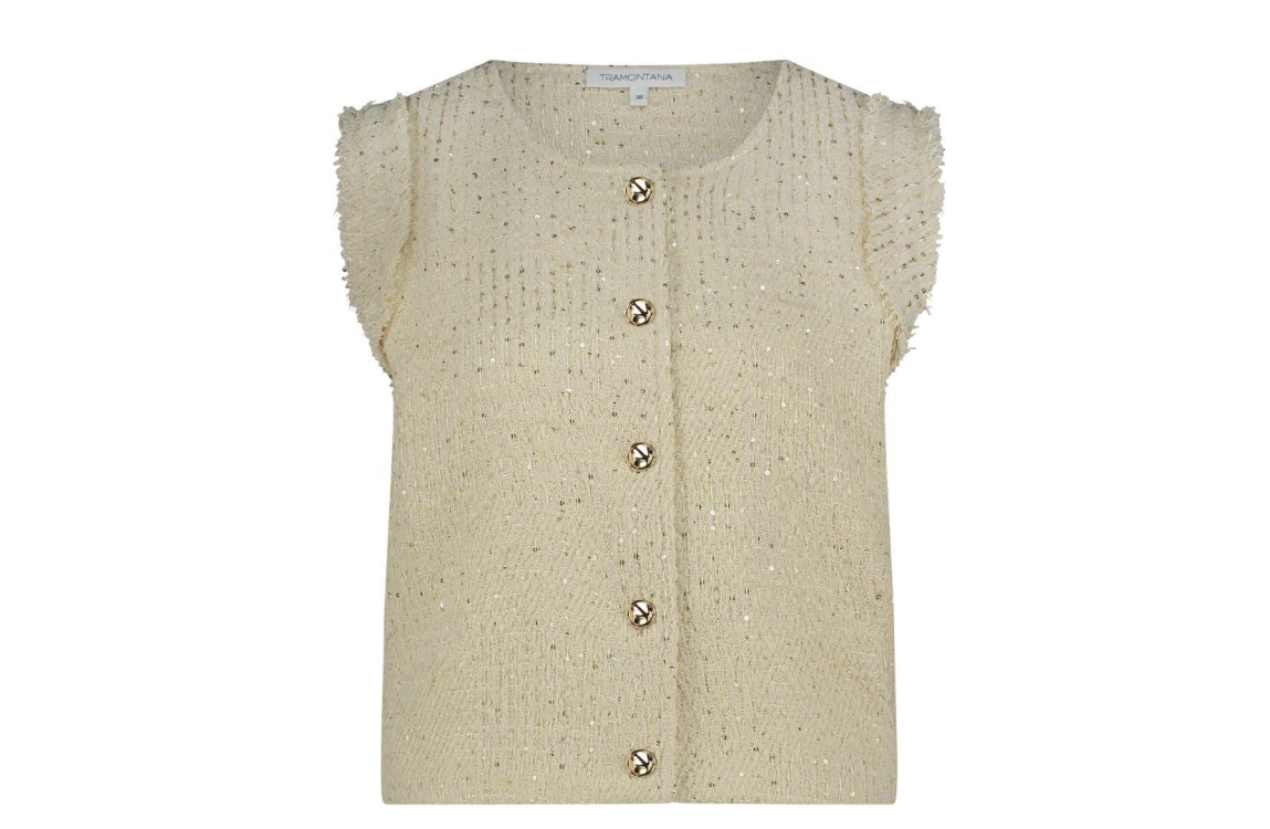 Tramontana gilet C23-16-801. Dit aangesloten model is voorzien van een ronde hals en is mouwloos. Deze créme kleurige gilet van Tramontana sluit door middel van knopen en is all-over bewerkt emt pailletten. Dit model is uitgevoerd in een tweed kwaliteit.