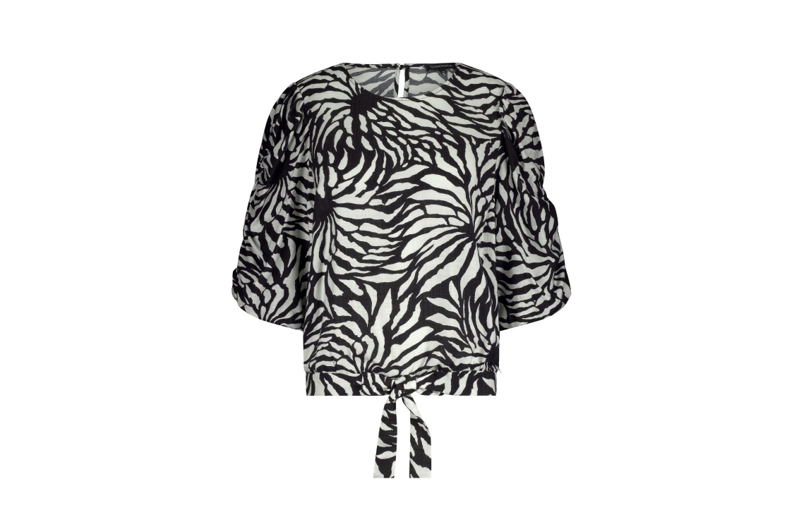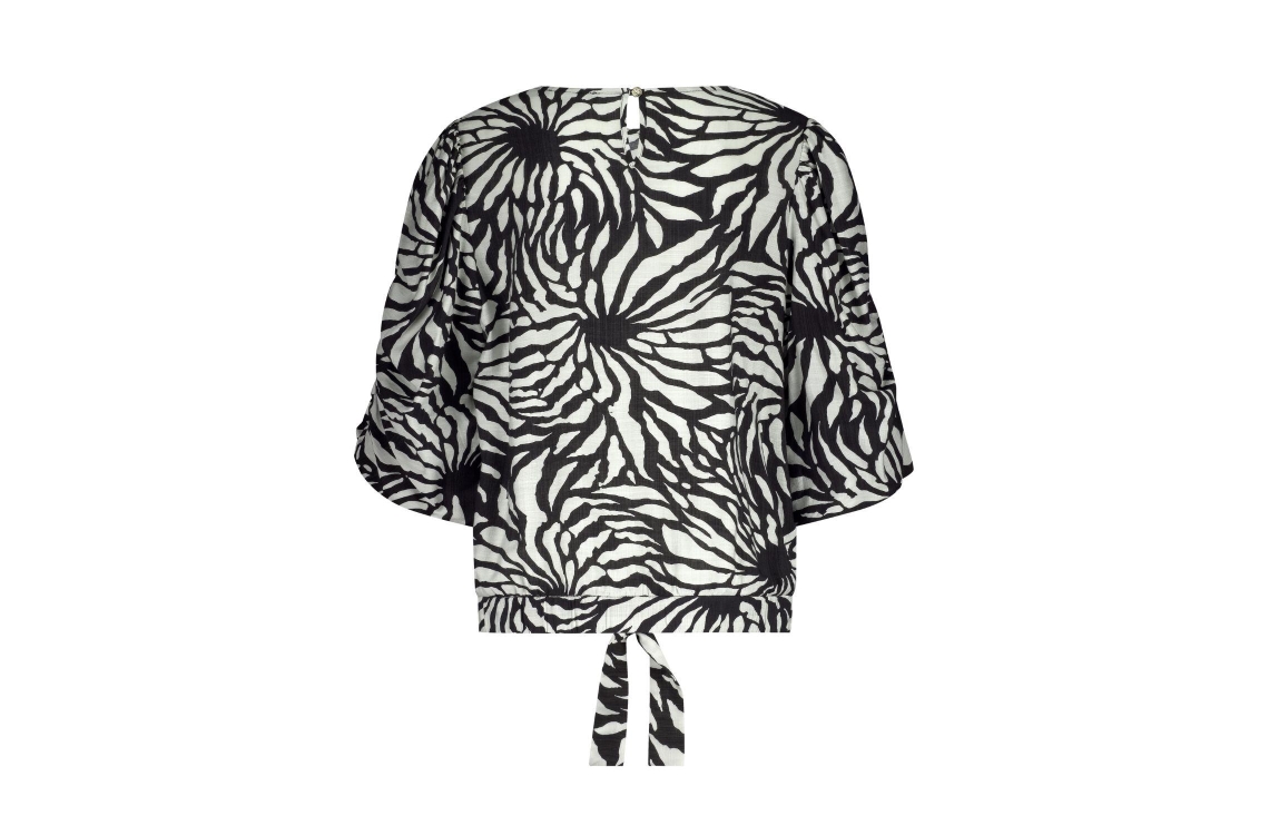 Tramontana Volume Sleeve Top Wildflower 009998 Print blacks. Dit rechtvallende model heeft een ronde hals en korte mouwen. Deze zwart/witte top van Tramontana is all-over bewerkt met een print. Dit model is voorzien van een strik aan de onderkant van de voorzijde.