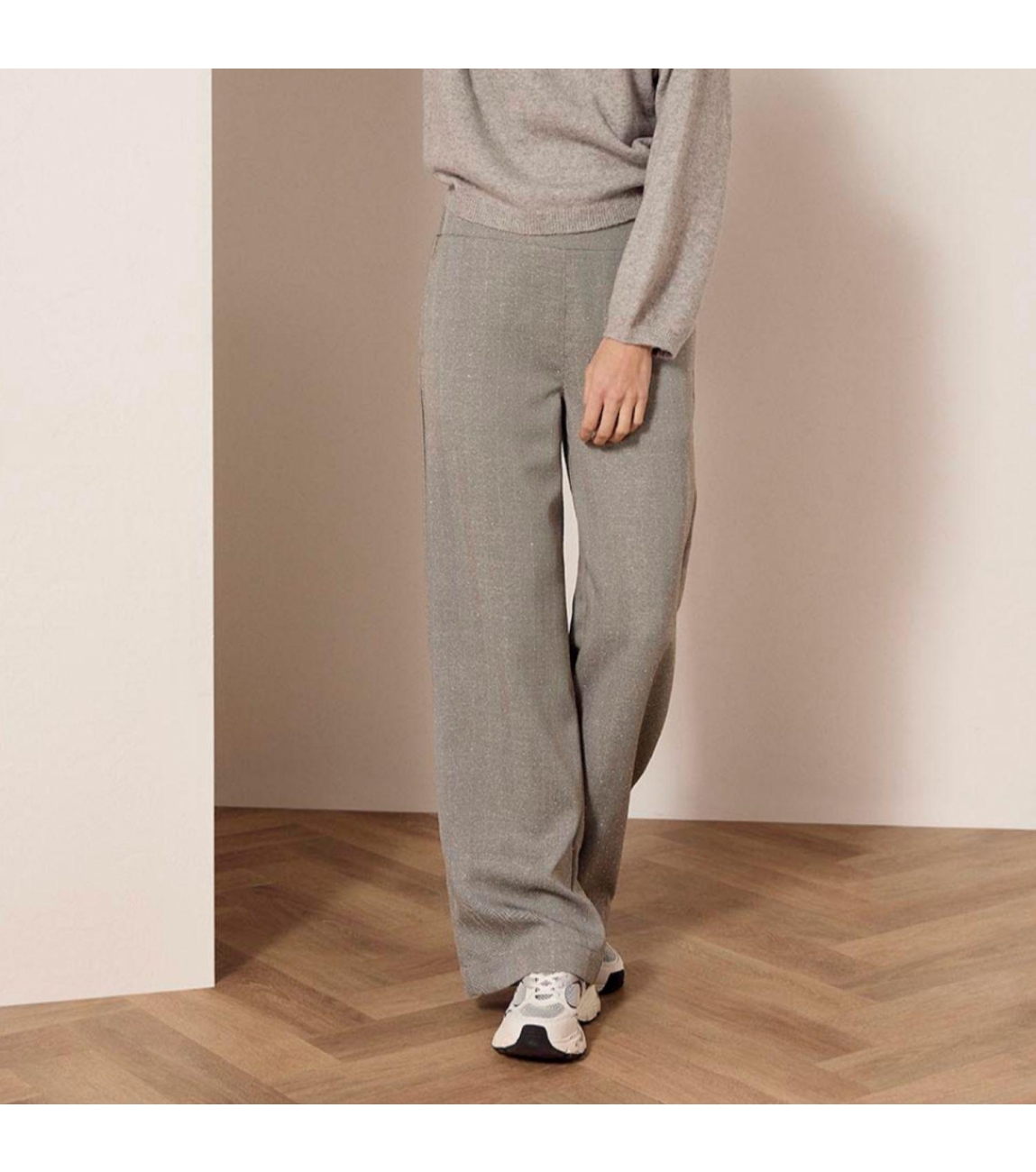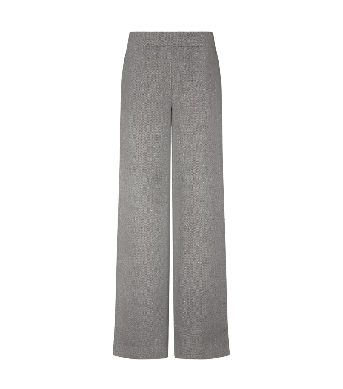 Tramontana broek C01-18-101. Dit wide leg model sluit door middel van elastische boord. Deze lichtgrijze broek van Tramontana is all-over bewerkt met een herringbone patroon en strass-steentjes. Het model is voorzien van twee steekzakken aan de voorzijde en twee paspelzakken aan de achterzijde.