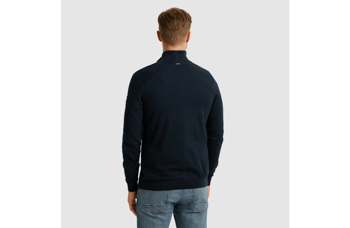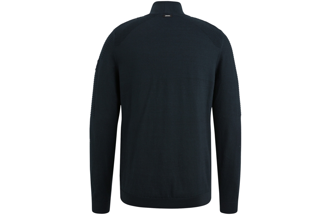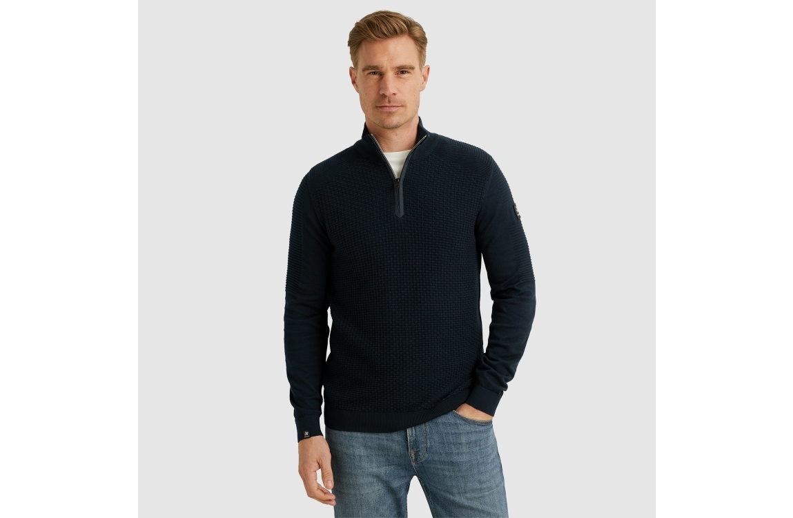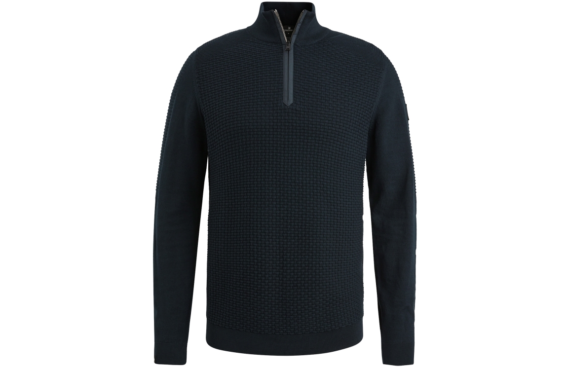 Vanguard pullover VKW2408308. Dit rechtvallend model is voorzien van een hoge hals met zipper en heeft lange mouwen. Deze donkerblauwe pullover van Vanguard is bewerkt met een motief aan de voorzijde.