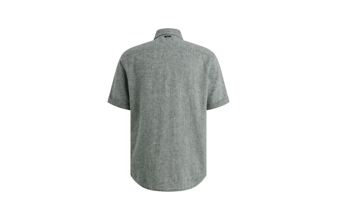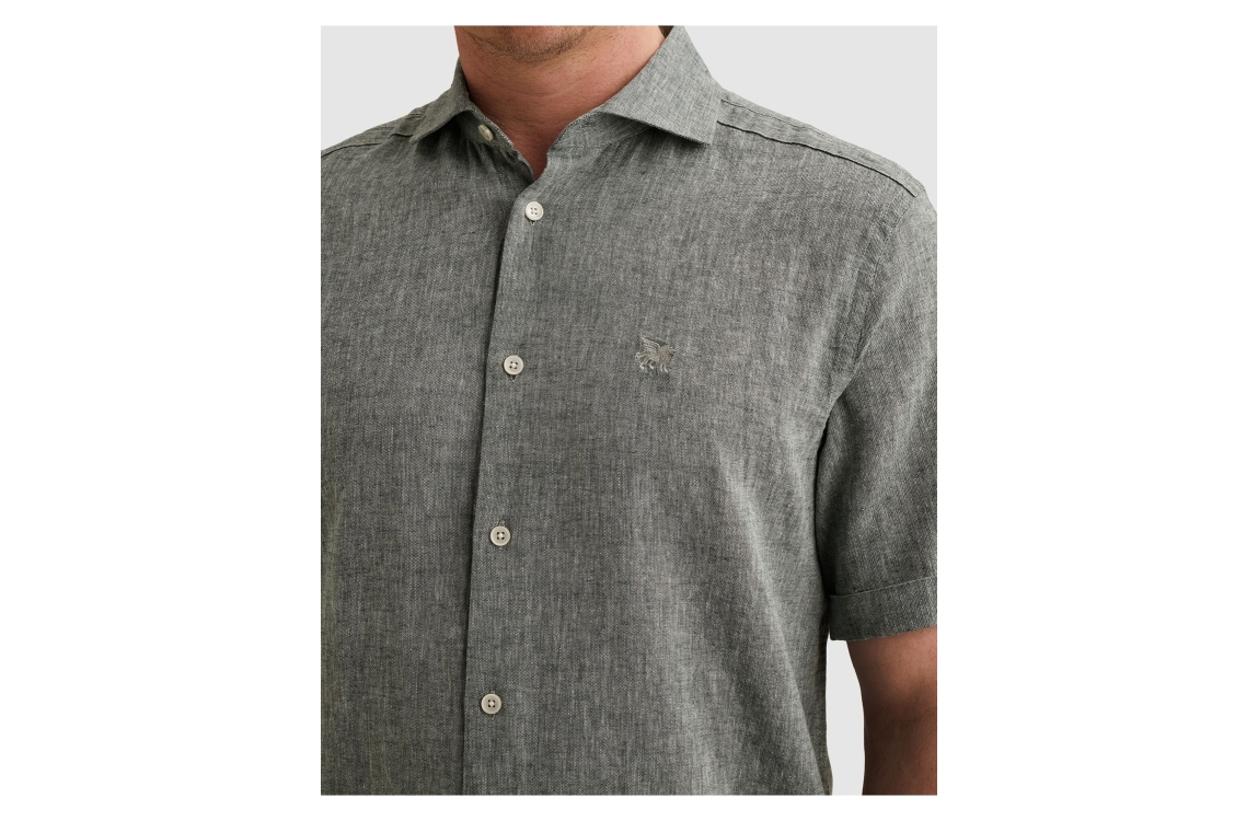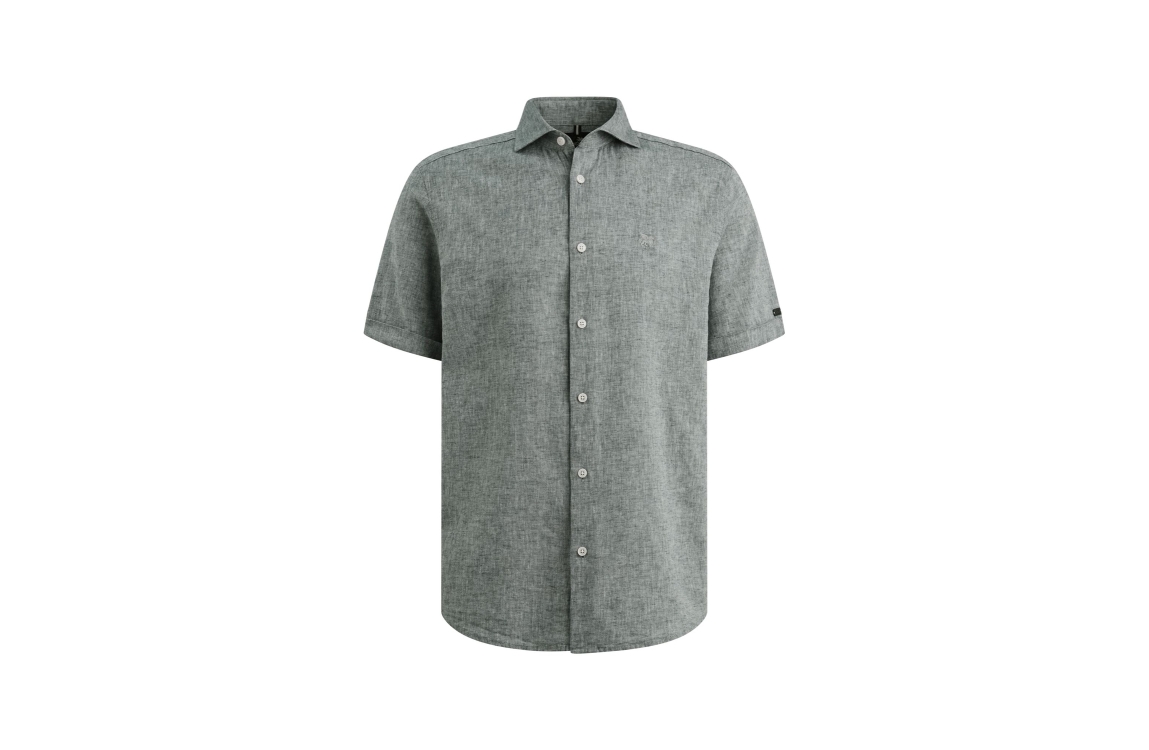 Vanguard short sleeve shirt linen cotton VSIS2604263. Dit rechtvallend model is voorzien van een kraag en heeft korte mouwen. Deze navykleurige gemeleerde overhemd van Vanguard sluit door middel van knopen en is afgewerkt met logo embleem op de borst.