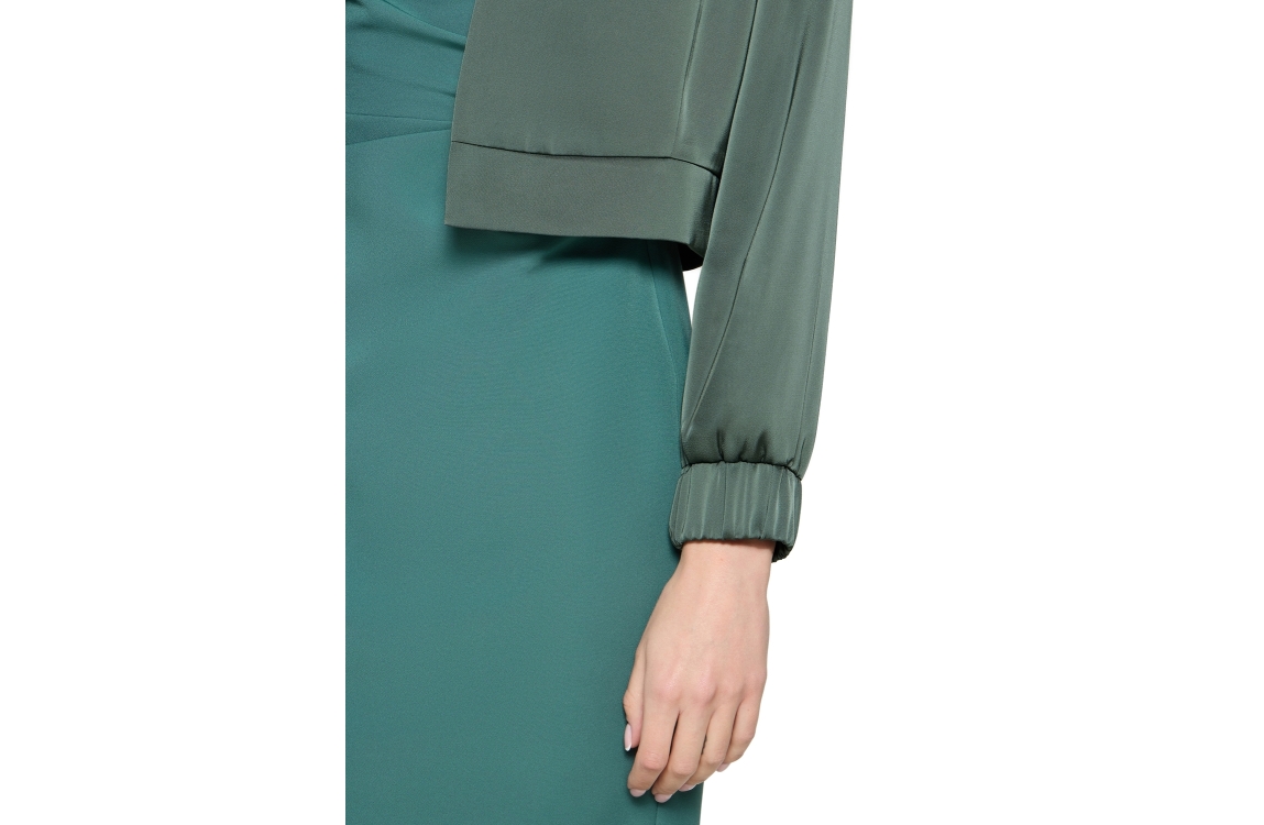 Vera Mont blazer 03054262. Dit cropped model heeft een ronde hals en lange mouwen. Dit groene jasje van Vera Mont is uitgevoerd in een bomber model, beschikt over schoudervulling en is afgewerkt met een elastische boord aan de onderzijde.