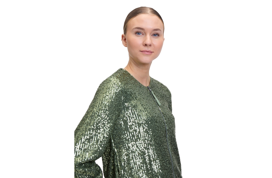 Vera Mont jasje 35414478. Dit regular fit model heeft een ronde hals, lange mouwen en sluit door middel van een rits. Dit groene jasje van Vera Mont is bewerkt met pailletten.