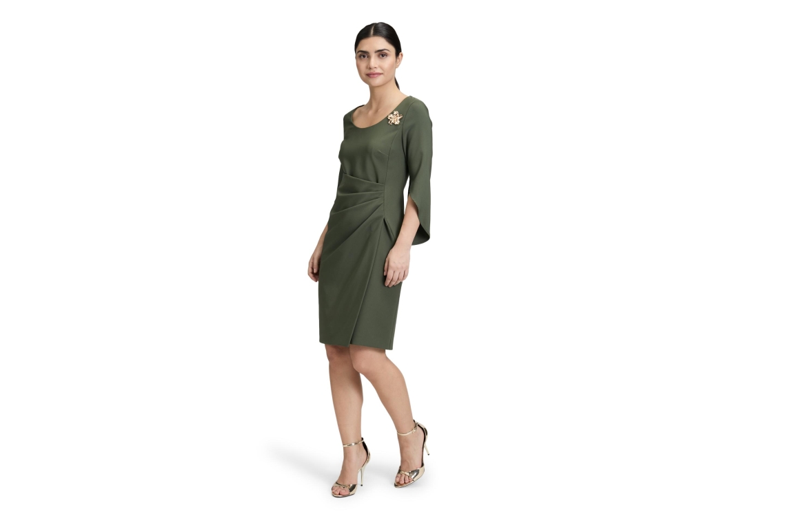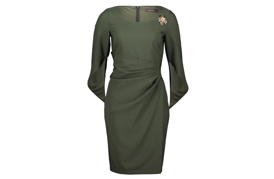 Vera Mont jurk 5117/4031/5583. Dit getailleerd model heeft een diepe, ronde hals en halfopen driekwartmouwen. Deze donkergroene jurk van Vera Mont is op de linkerborst gedetailleerd met een broche en sluit aan de achterzijde door middel van een (blinde) rits. Het model is afgewerkt met plooidetails op de taille en is uitgevoerd in stretchkwaliteit.
