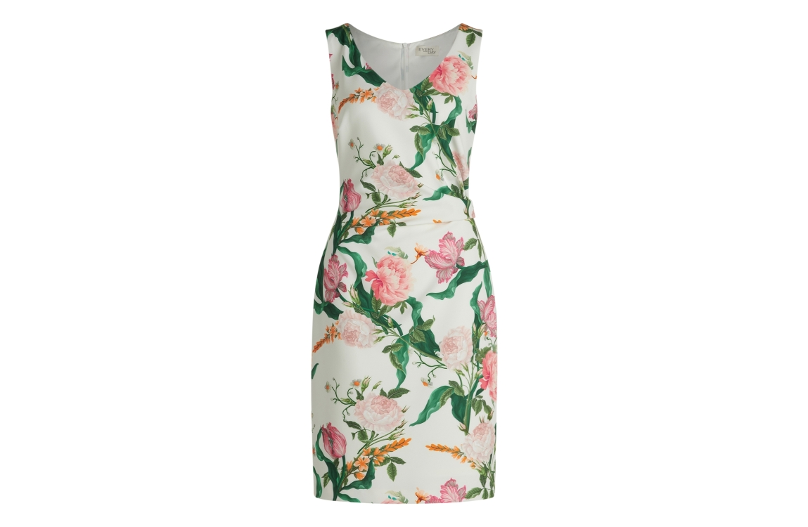 Vera Mont jurk 70904102. Dit aangesloten model heeft een v-hals, is mouwloos en sluit door middel van een rits aan de achterzijde. Deze witte jurk van Vera Mont is bewerkt met een bloemenprint en afgewerkt met een gedrappeerde zijde.