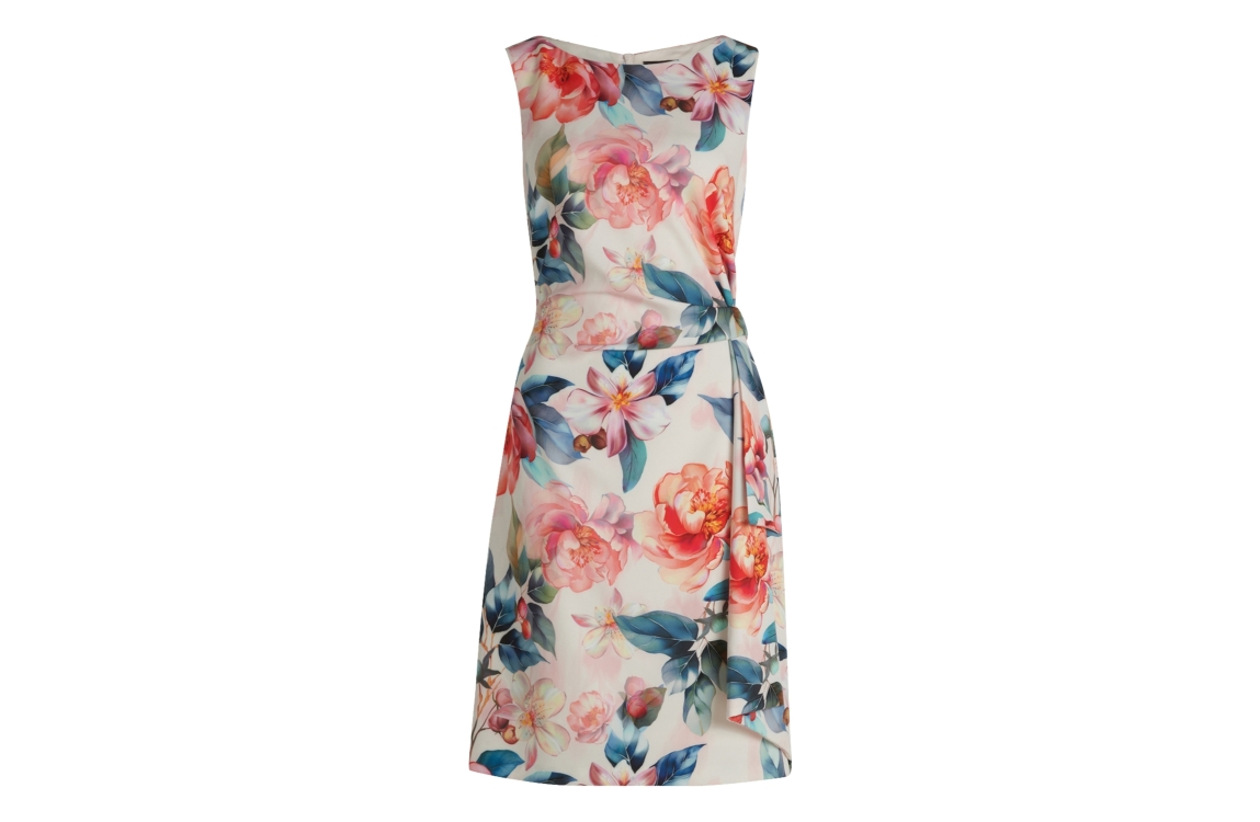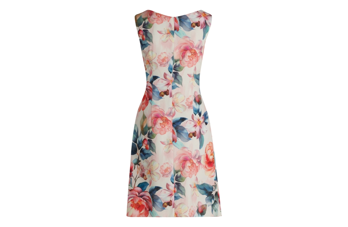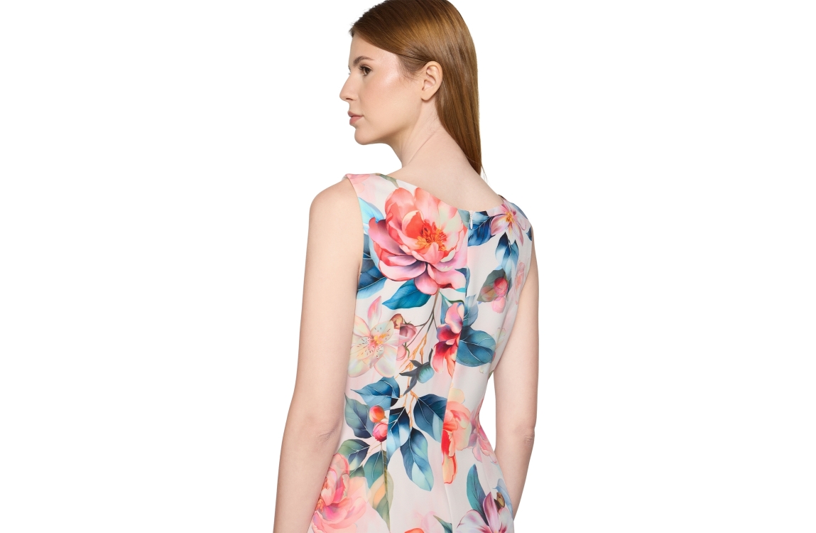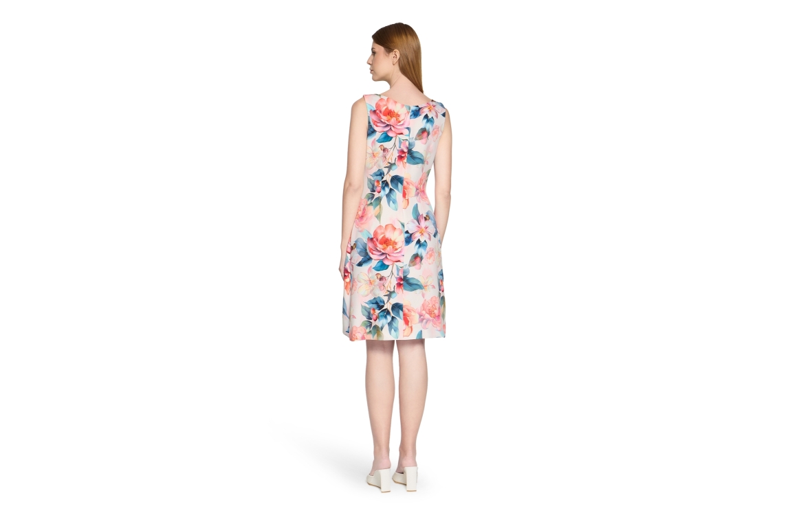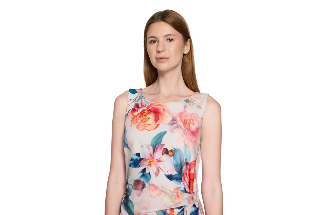 Vera Mont Jurk 0414/4801/4836. Dit soepelvallende model sluit door middel van een rits en heeft een ronde hals zonder mouwen. Deze Rose Vera Mont jurk is bewerkt met een bloemen print. Dit model is voorzien van een strik detail aan de voorzijde.