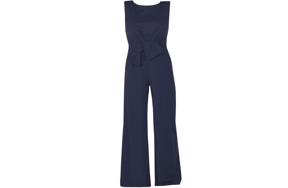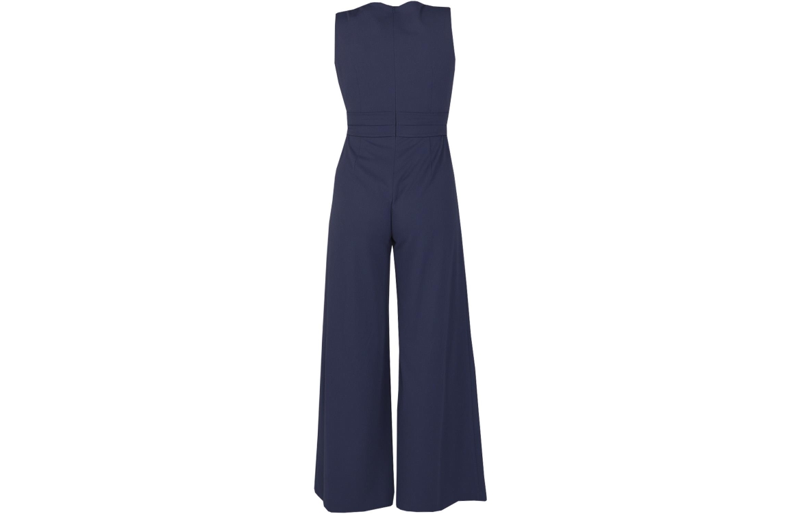 Vera Mont jumpsuit 0178/4867/8257. Dit regular fit model heeft een ronde hals en is mouwloos. Deze donkerblauwe jumpsuit van Vera Mont is voorzien van een strikceintuur op de taille en beschikt over twee steekzakken. Het model sluit aan de achterzijde door middel van een rits en is uitgevoerd in een wide fit model.
