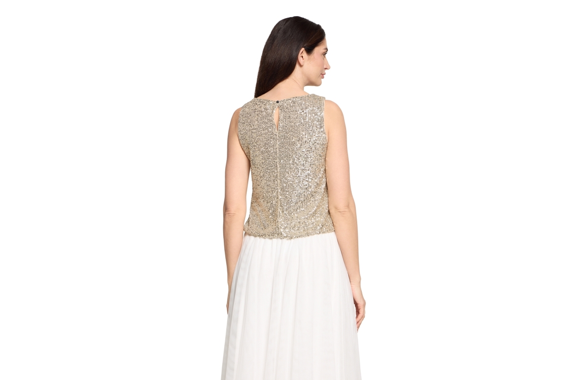 Vera Mont top 04044478. Dit soepelvallend model heeft een hoge ronde hals en is mouwloos. Deze gouden pailetten top van Vera Mont sluit aan de achterzijde met een klein knoopje.