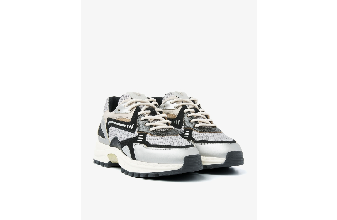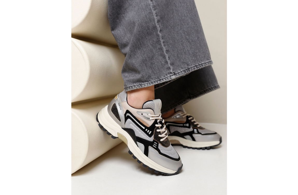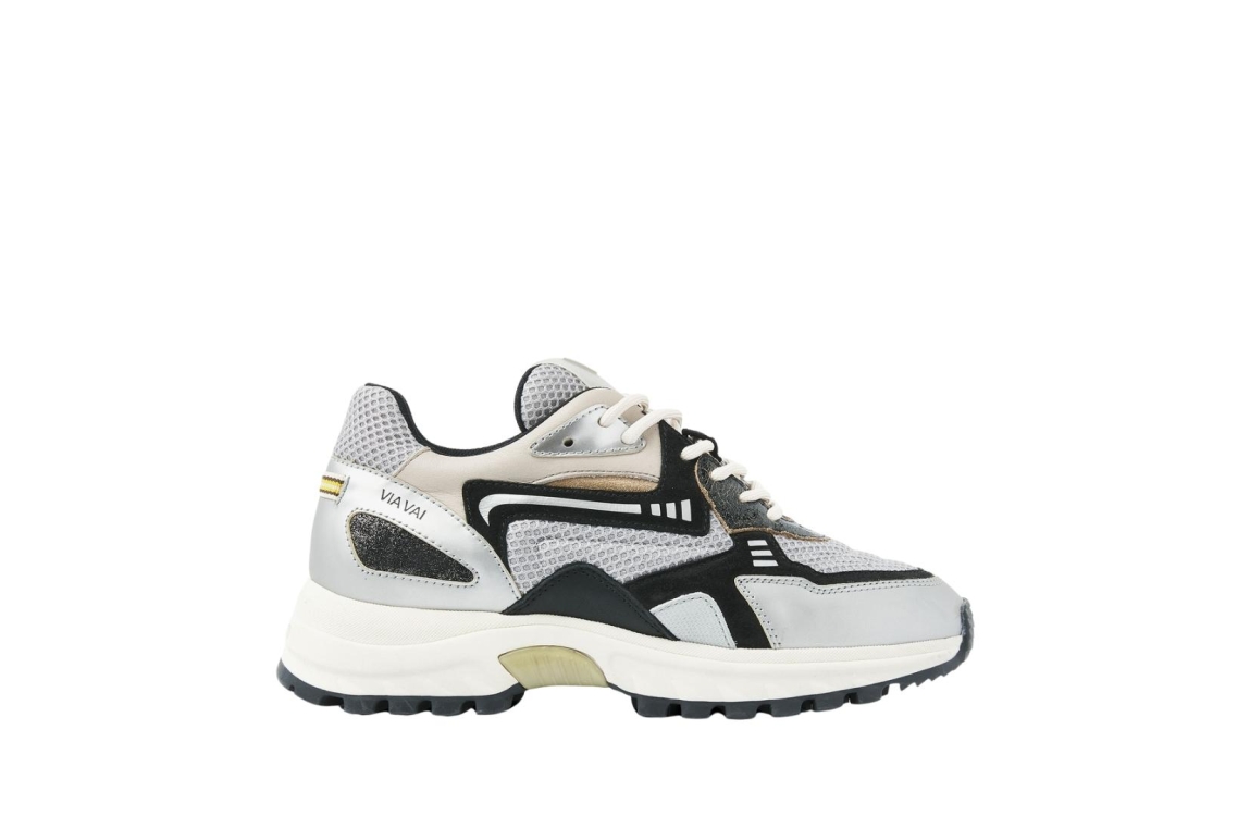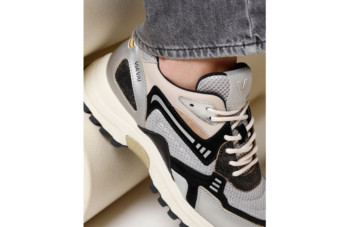 Via Vai Danae Noah 04-224 Lame combi 62222. Dit sportieve model sluit door middel van veters. Deze grijze sneakers van Via Vai zijn bewerkt met goud en zwarte details en een chunky zool.