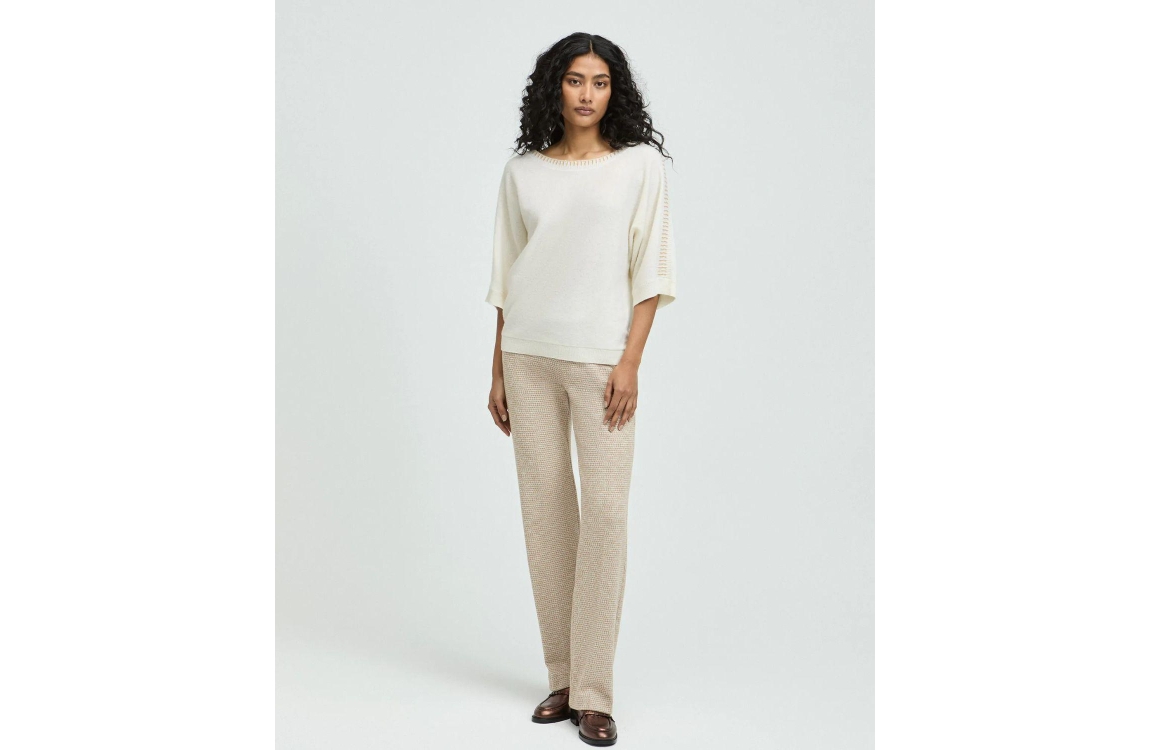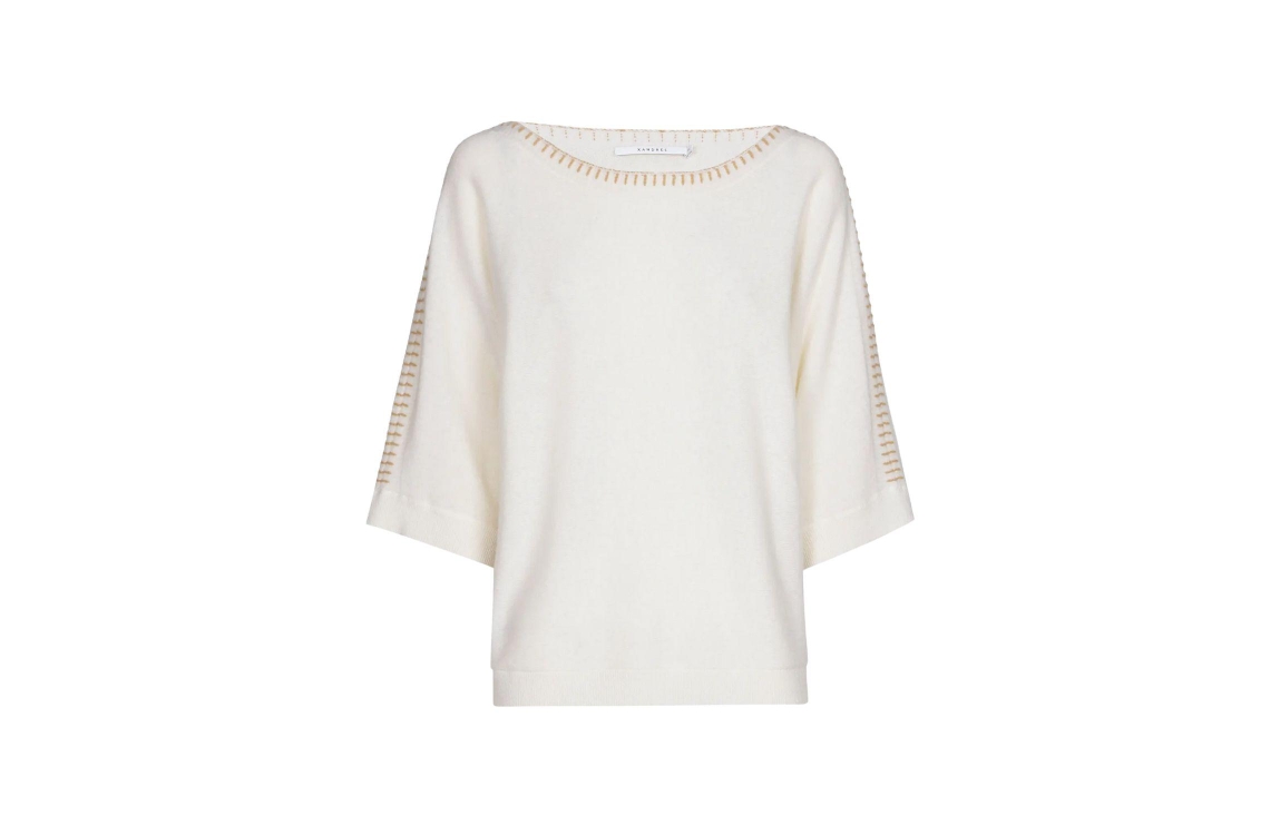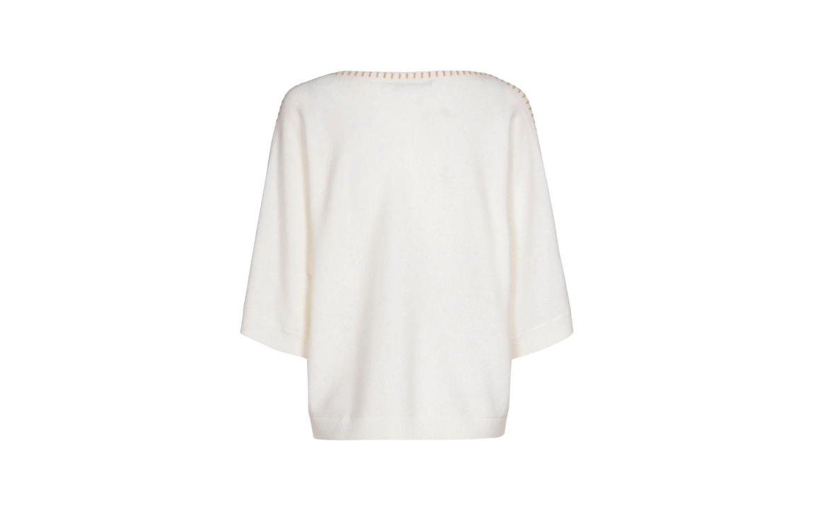 Xandres AGILA 1846 mount blanc. Dit wijdvallende model is voorzien van een ronde hals en driekwart mouwen. Deze witte top van Xandres is op de schouder en boorden bewerkt met details.