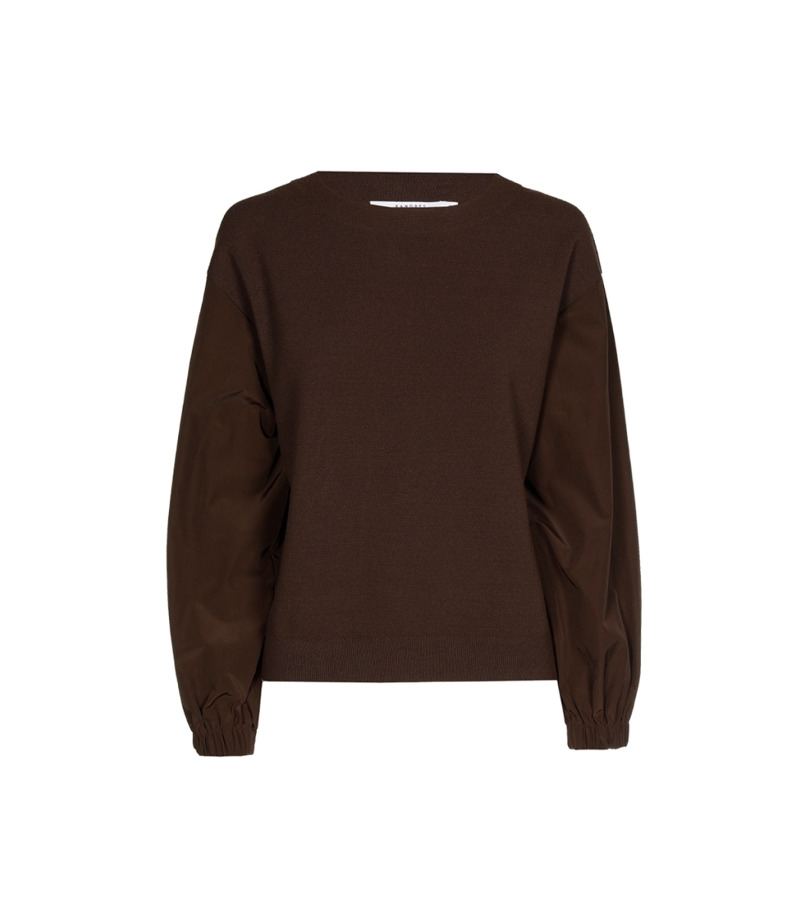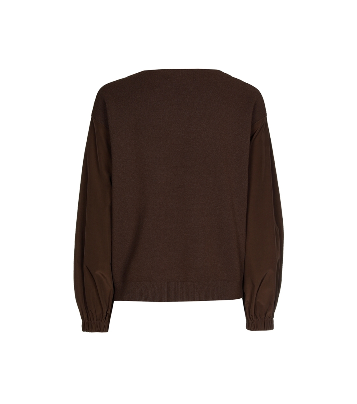 Xandres pullover Ahlem 29418-01. Dit rechtvallend bruine model is voorzien van een ronde hals en heeft lange mouwen uitgevoerd in een andere stofkwaliteit.