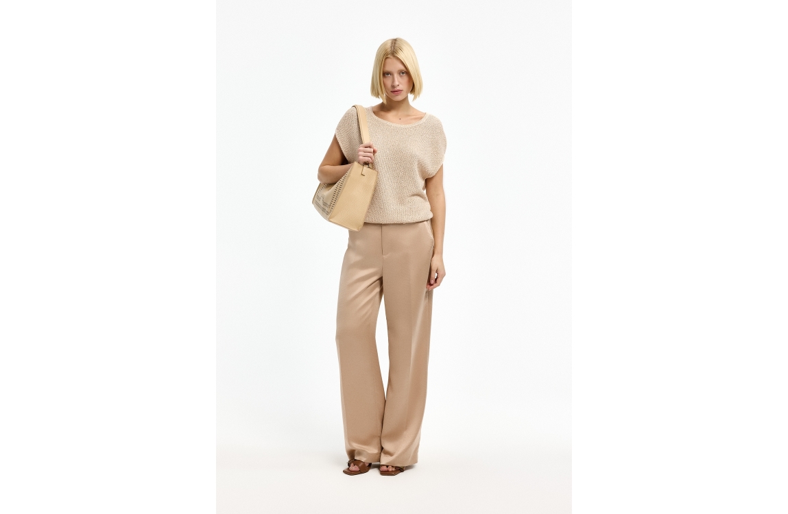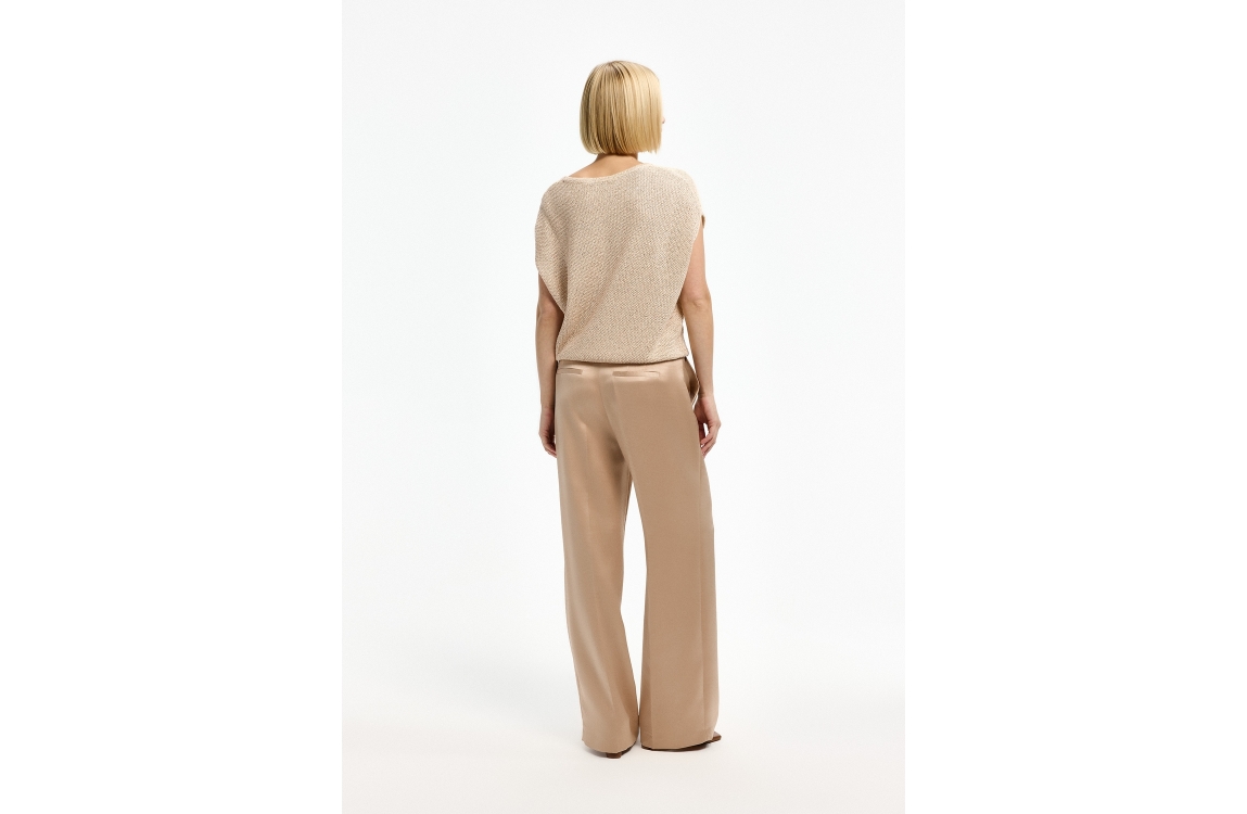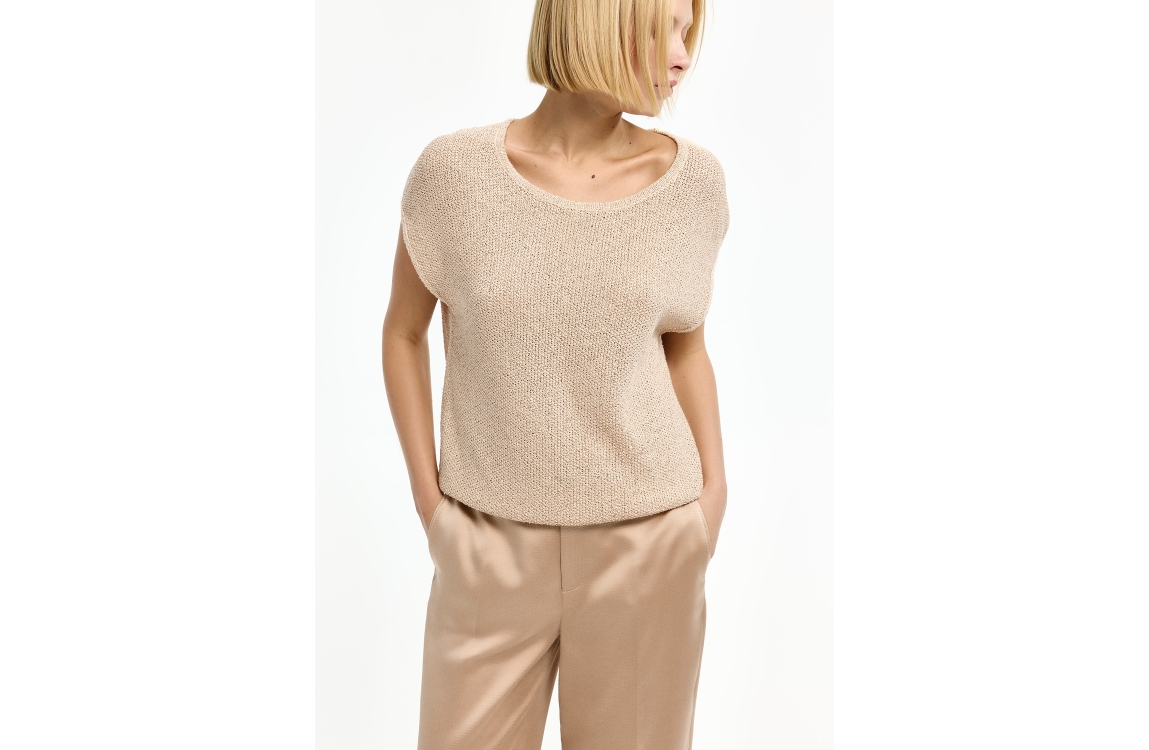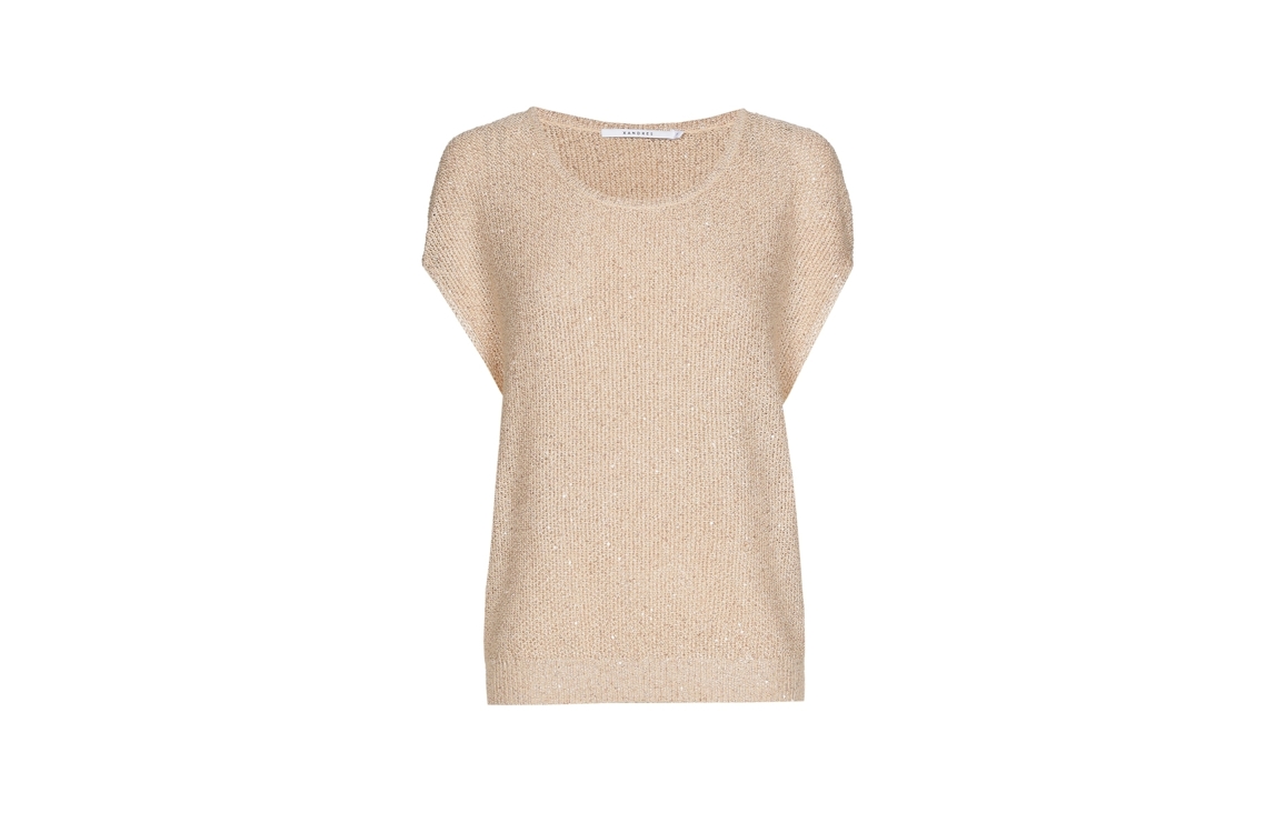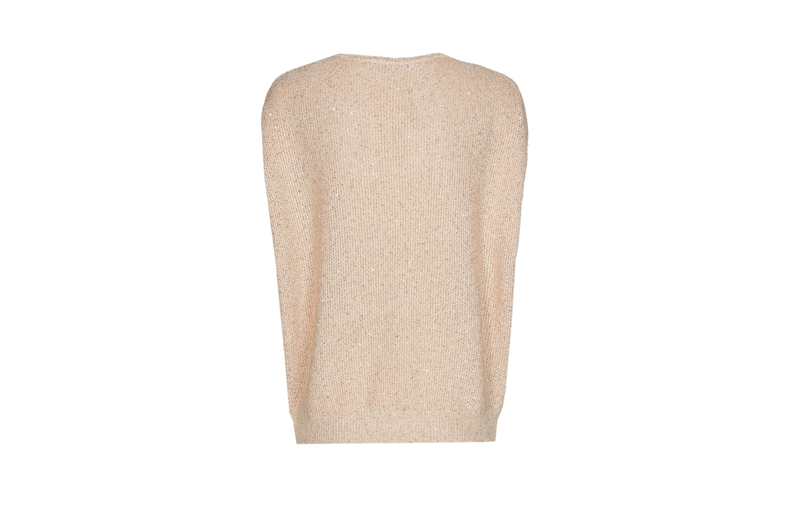 Xandres pullover 29551-01 0776. Dit wijdvallende model heeft een ronde hals en is mouwloos. Deze lichtbeige pullover van Xandres is uitgevoerd in fijn gebreide kwaliteit met pailletten en is afgewerkt met een ribgebreide zoom.