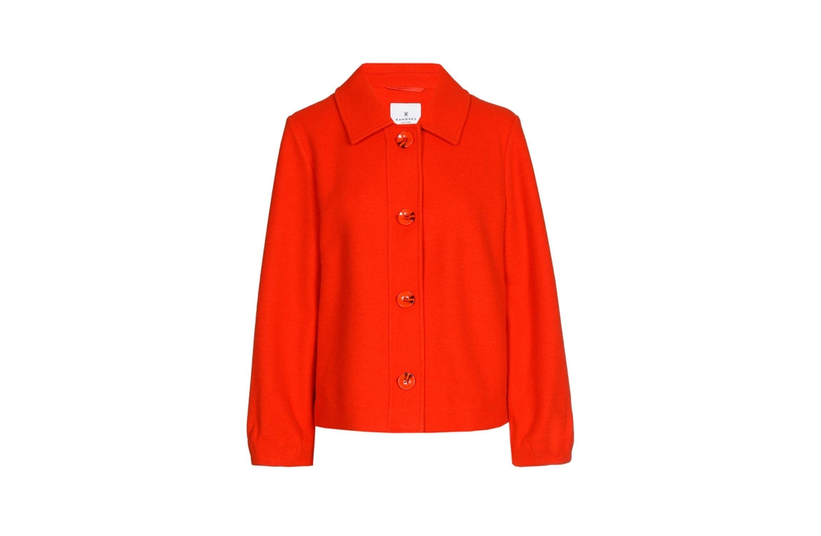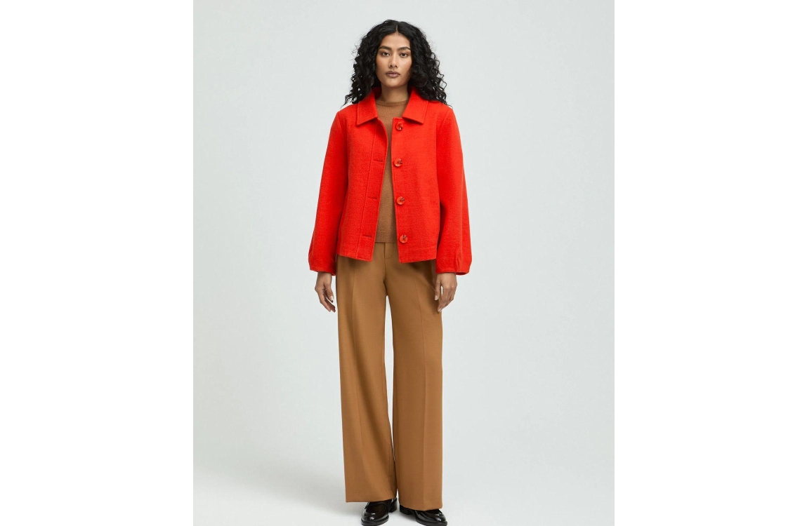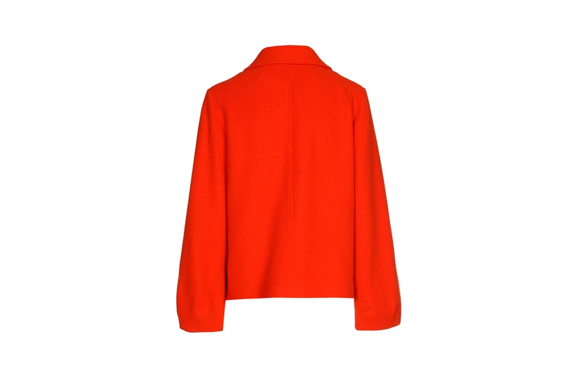 Xandres BRAMMA 0510 scarlet red. Dit rechtvallende model heeft een kraag en lange mouwen. Dit rode jasje van Xandres sluit door middel van knopen en is voorzien van gestikte plooien aan de mouwen.