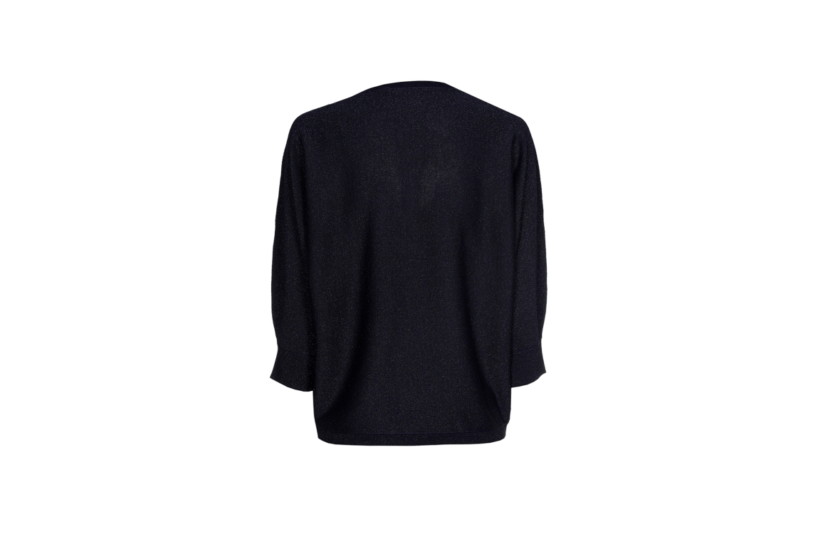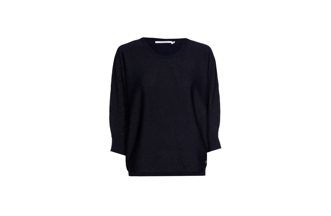 Xandres pullover Gerrett 29008-03. Dit rechtvallend model is voorzien van een ronde hals en heeft driekwart mouwen. Deze donkerblauwe pullover van Xandres is uitgevoerd met glitter all-over.
