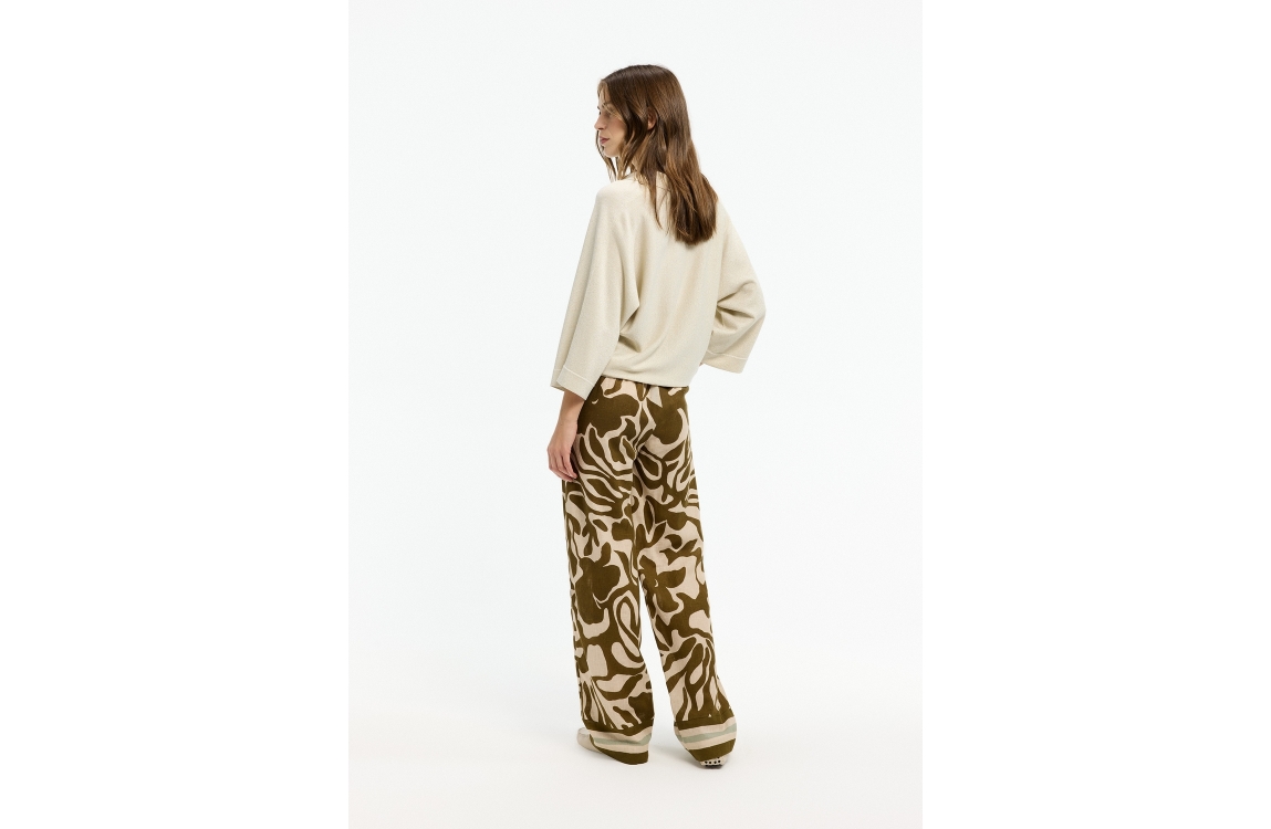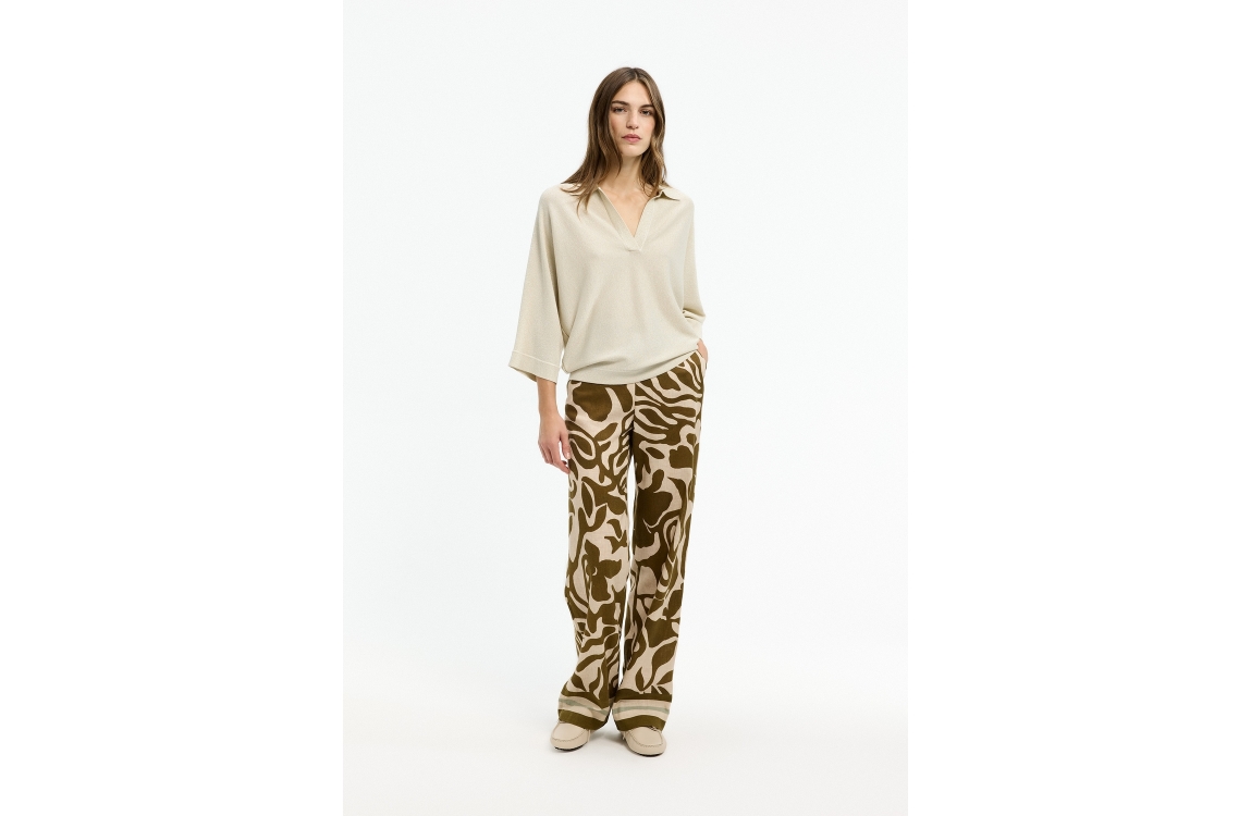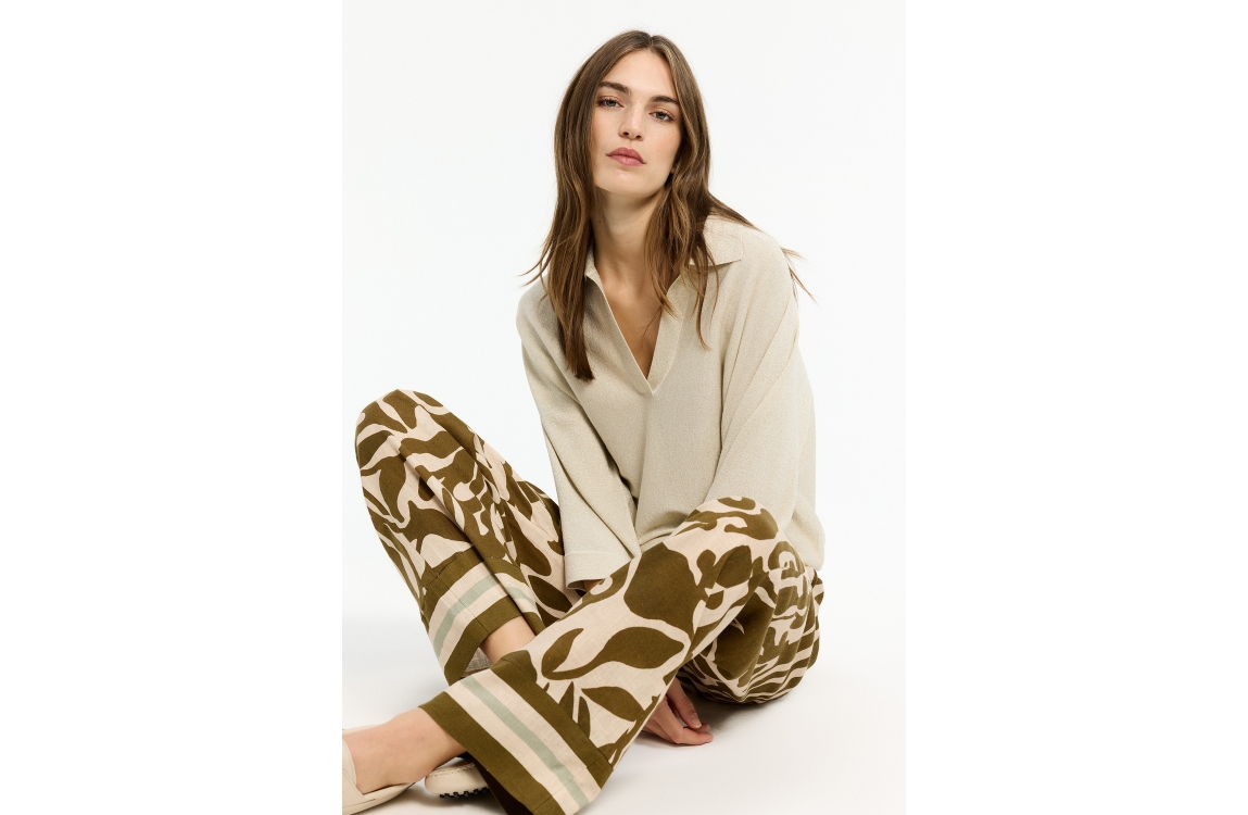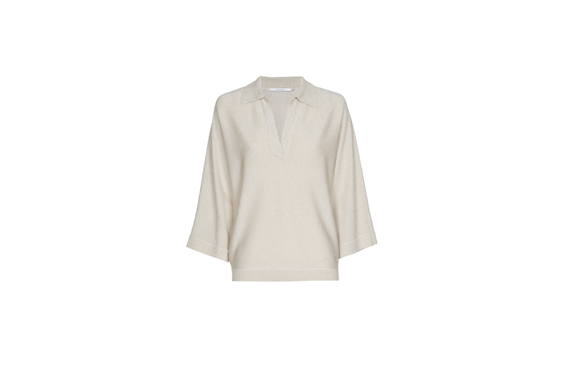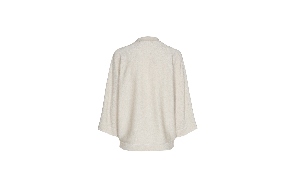 Xandres pullover 29545-01 1845. Dit wijdvallende model heeft een V-hals en driekwart/lange mouwen. Deze off-white pullover van Xandres is all-over bewerkt met glitterlurex en is uitgevoerd in stretchkwaliteit.
