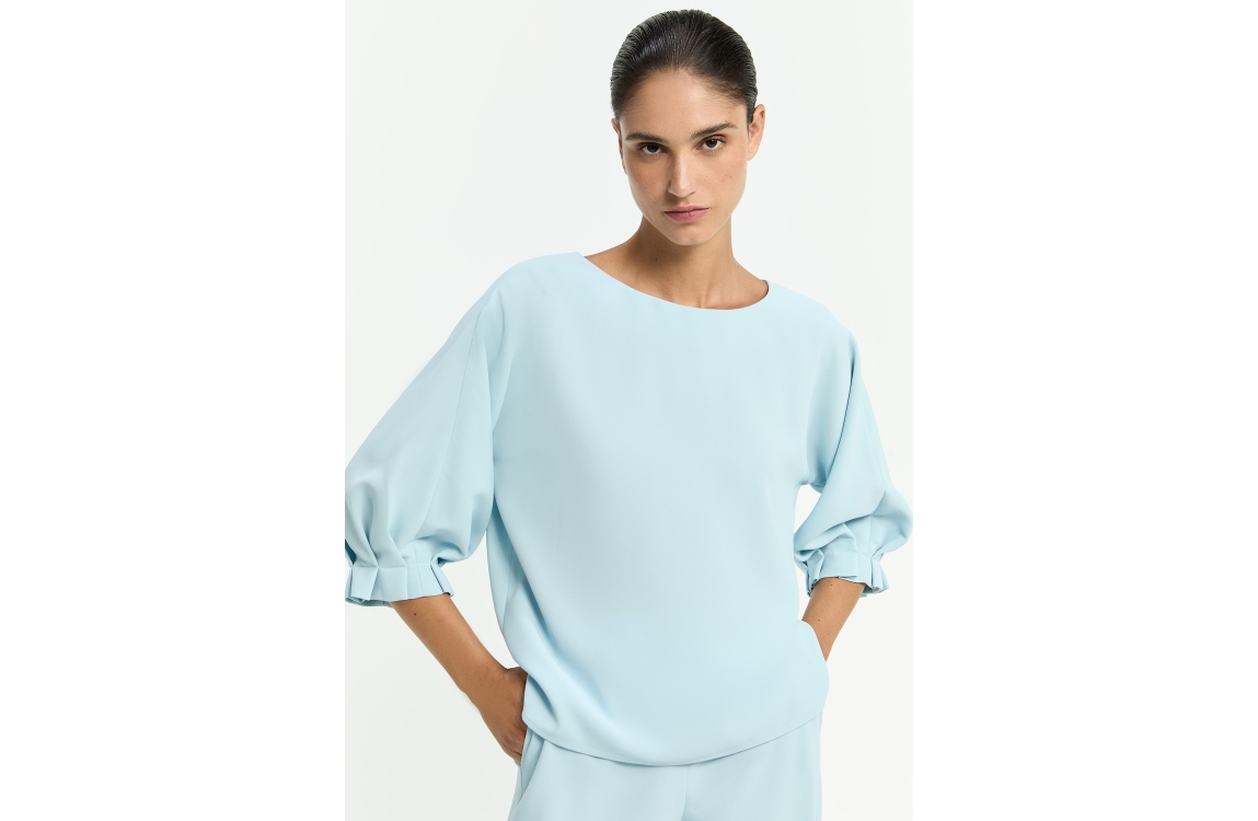Xandres HEDWIGE 6520 dream blue. Dit soepelvallende model is voorzien van een ronde hals en driekwart mouwen. Deze licht blauwe blouse van Xandres is afgewerkt met aangesneden mouwen en een spilt in de zijnaden van de onderzijde.