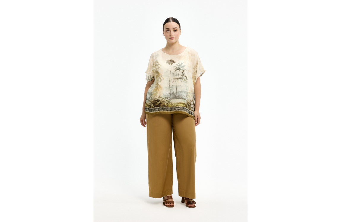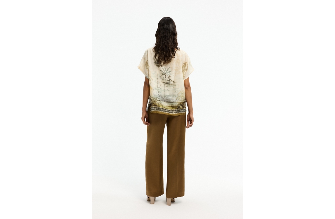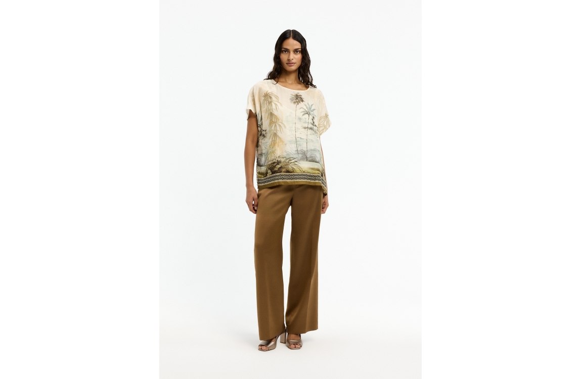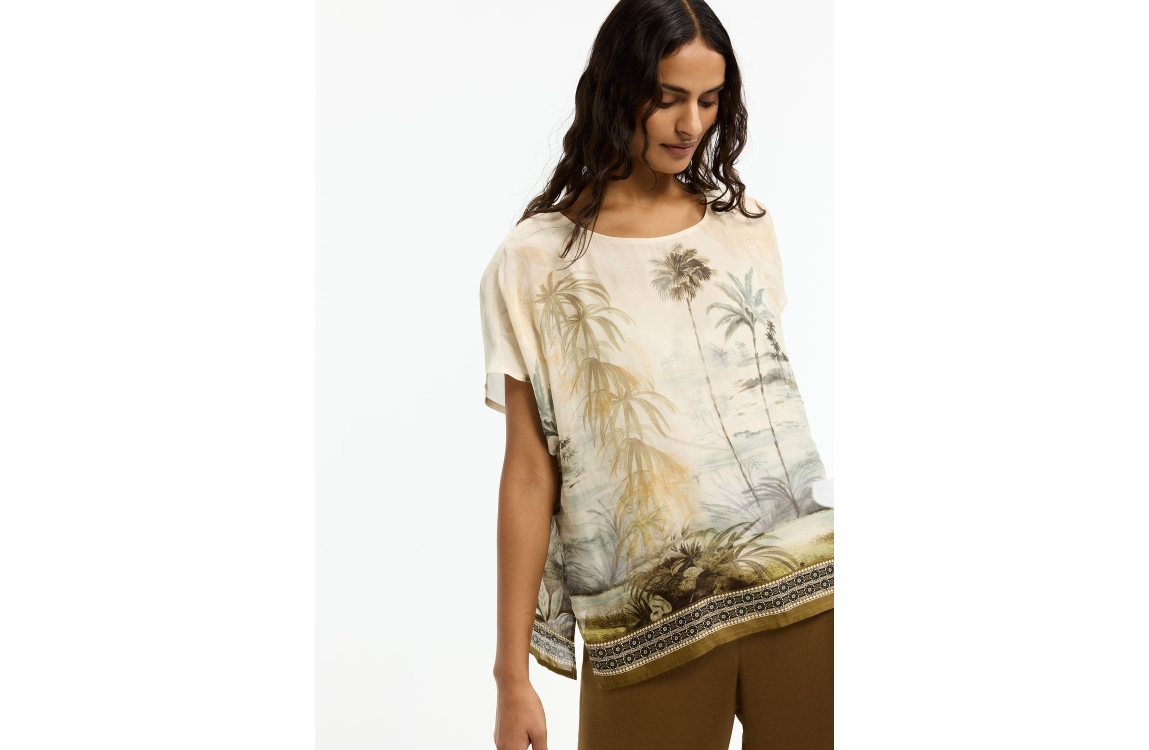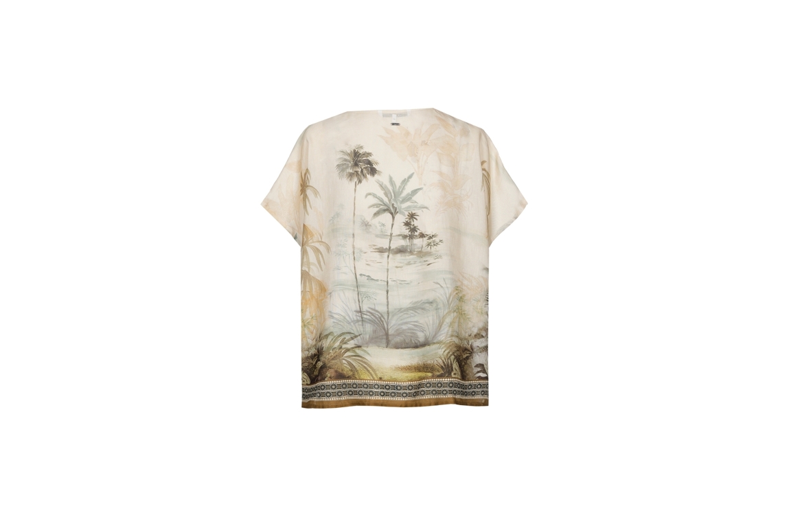 Xandres blouse 61625-01 0916. Dit wide fit model heeft een ronde halslijn en korte, aangesneden mouwen. Deze multi-colour blouse van Xandres is uitgevoerd in een semi-transparante stof en is all-over bewerkt met een zomerse palmboomprint.
