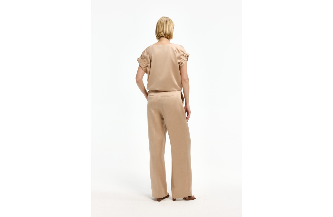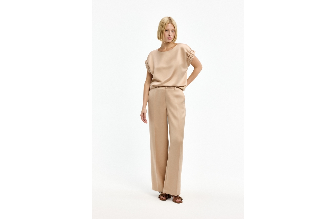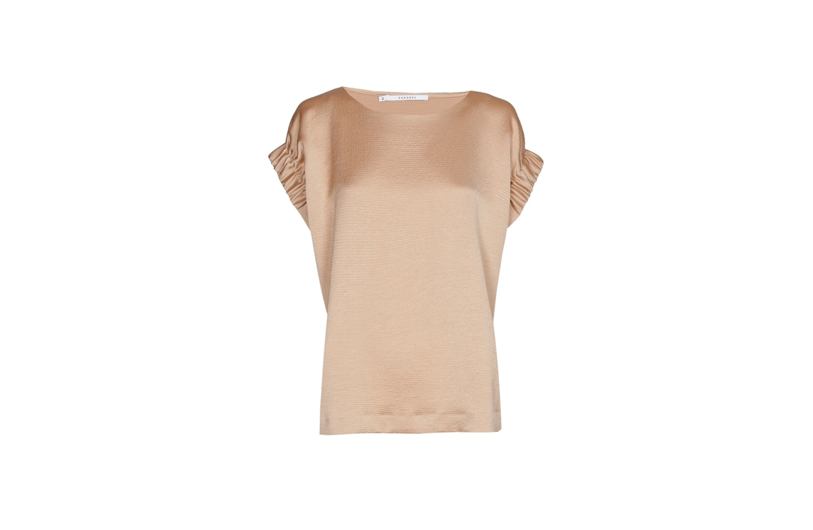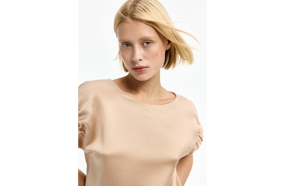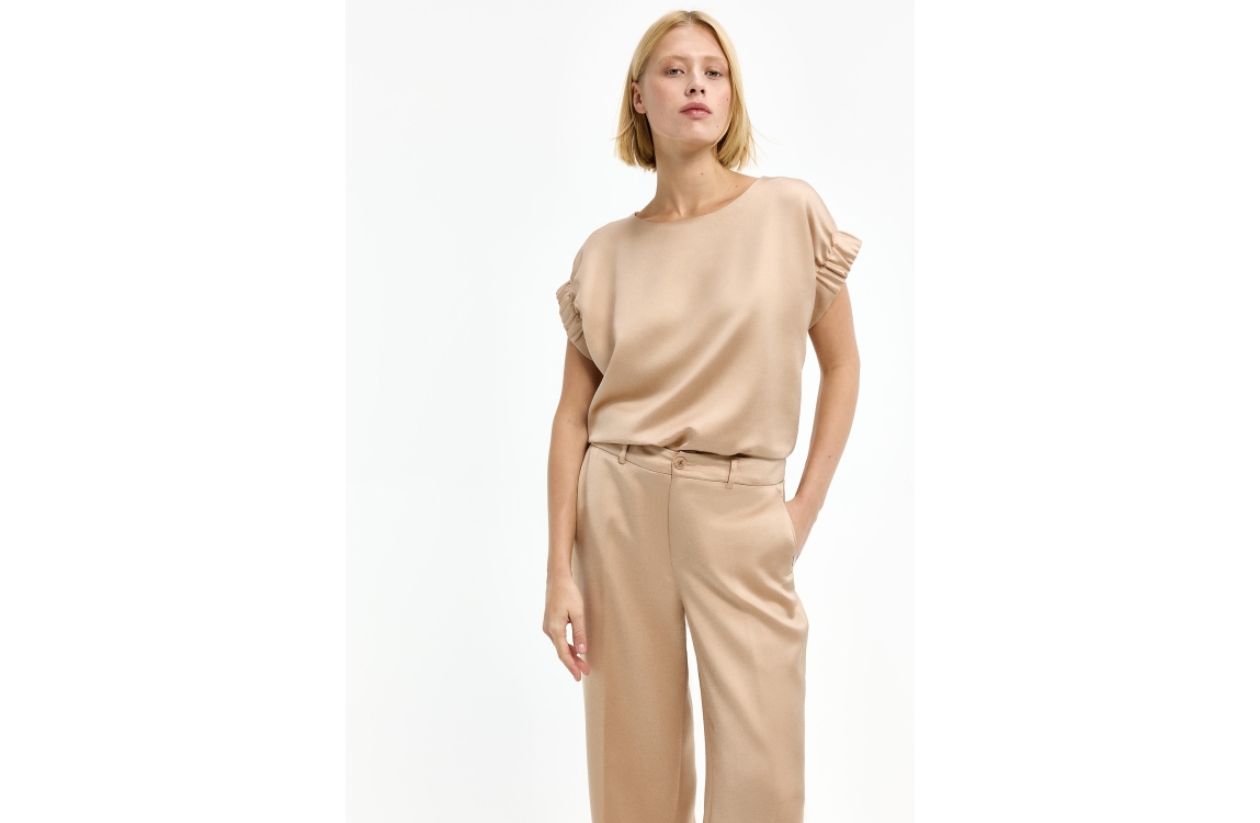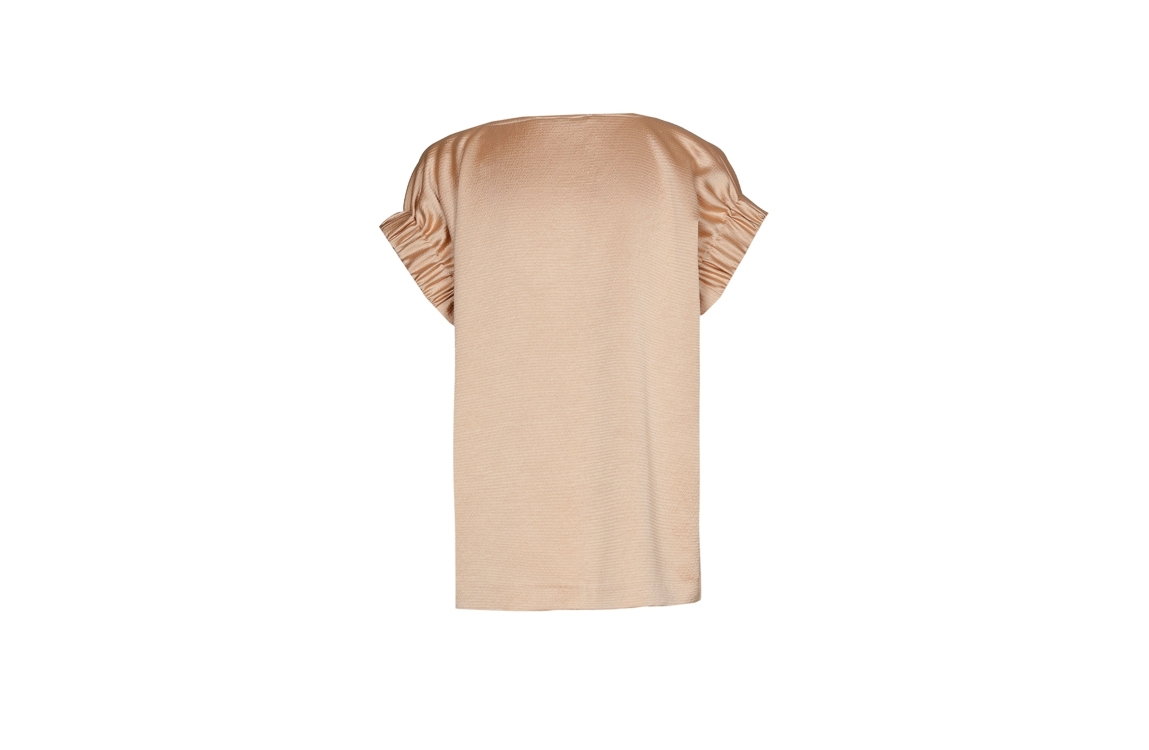 Xandres blouse 14565-01 0420. Dit rechtvallende model heeft een ronde halslijn en korte, afgesneden mouwen. Deze beigekleurige blouse van Xandres is uitgevoerd met een satijnen-look en is afgewerkt met elastische mouwboorden.