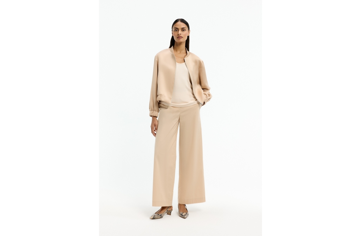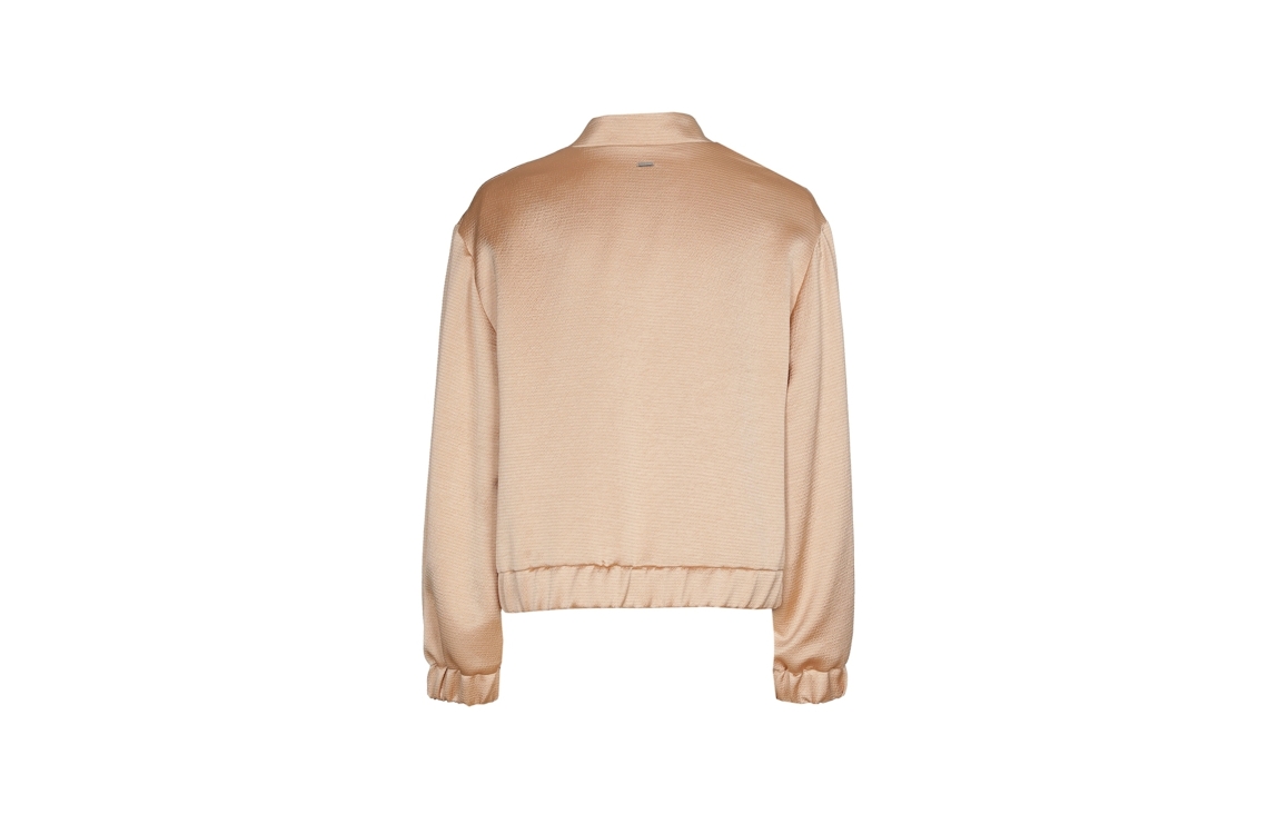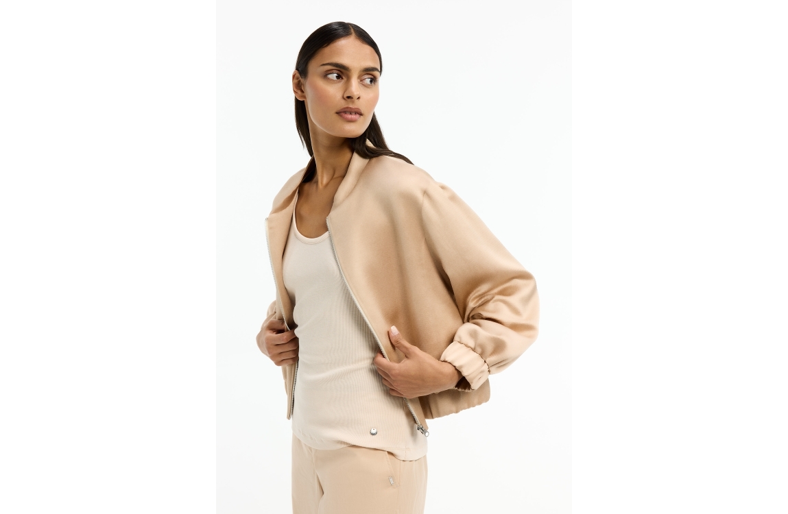 Xandres jasje 14568-01 0420. Dit sportieve model heeft een ronde halslijn en lange mouwen. Het beigekleurige jasje van Xandres sluit aan de voorzijde door middel van een rits en is uitgevoerd met een satijnen-look. Het model is afgewerkt met elastische boorden.
