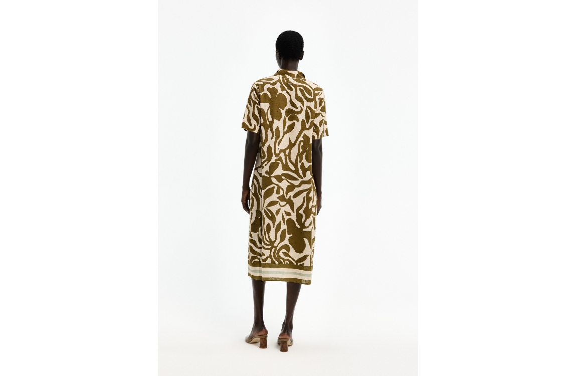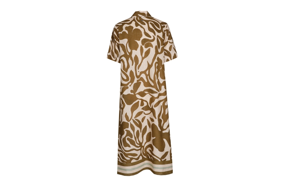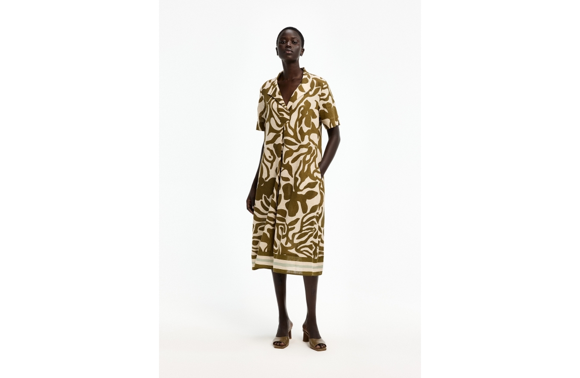 Xandres jurk 14553-01 0995. Dit wijdvallende model heeft een kraag met V-hals en korte mouwen. Deze donkergroene jurk van Xandres is all-over bewerkt met een lichte, grafische print en is voorzien van twee steekzakken.