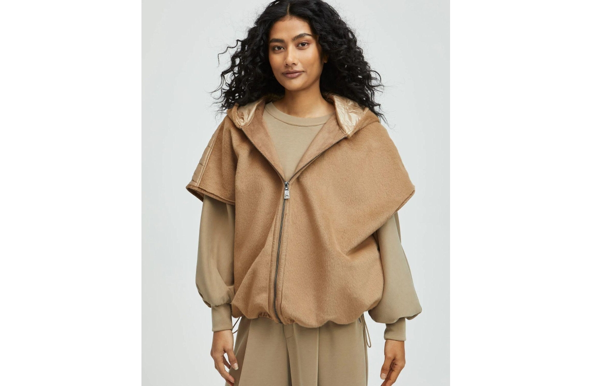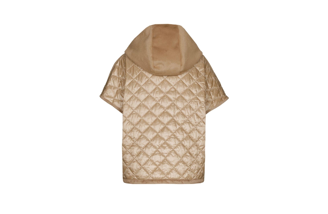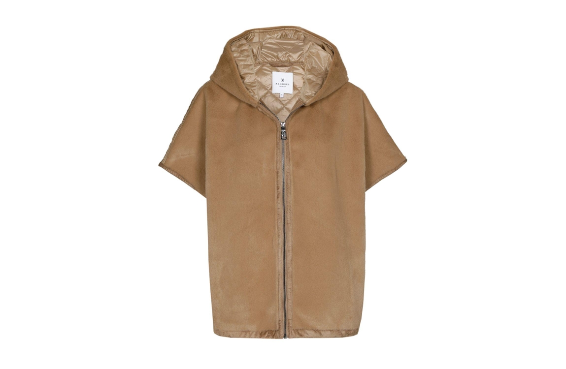 Xandres MOEMA 0270 cappucino. Dit rechtvallende model heeft korte mouwen en een ronde hals met capuchon. Deze bruine mantel van Xandres sluit aan de voorzijde door middel van een rits. Dit model heeft een zachte voorkant en achterkant met matelassé effect.