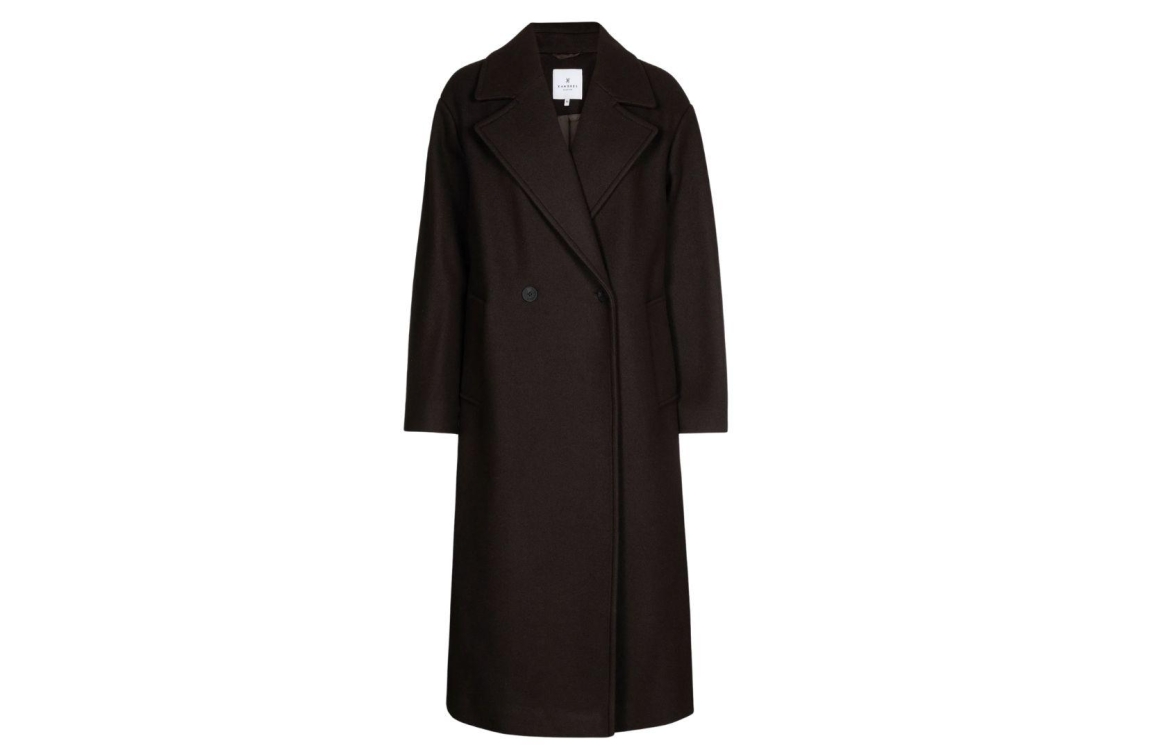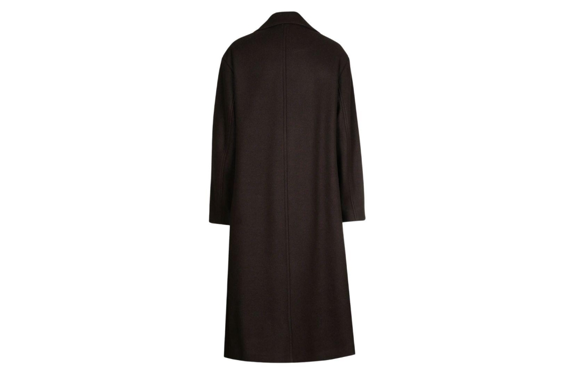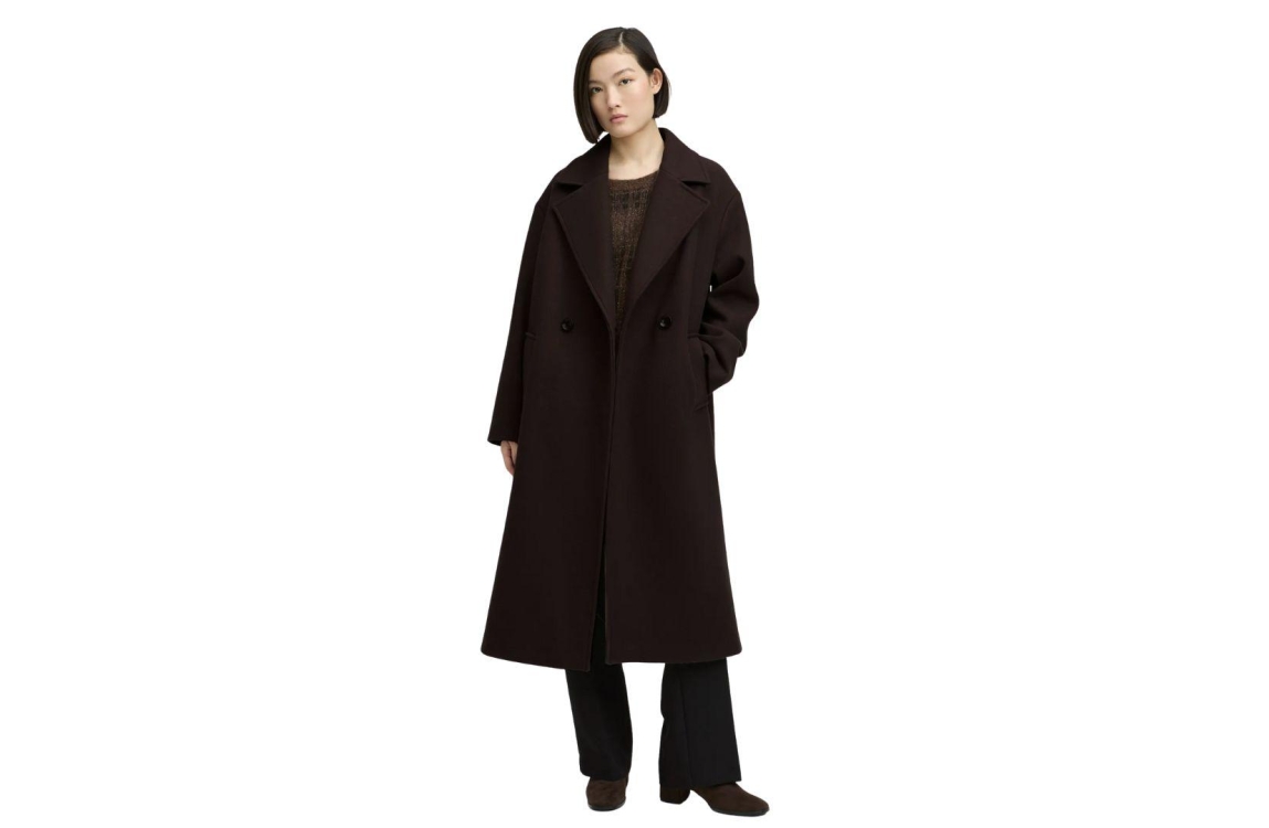 Xandres jas Mopthy 61485-01. Dit loose fit model heeft een brede reverskraag en lange mouwen. Deze donkerbruine jas van Xandres sluit met een knoopsluiting en is voorzien van twee schuine, gedetailleerde steekzakken aan de voorzijde.