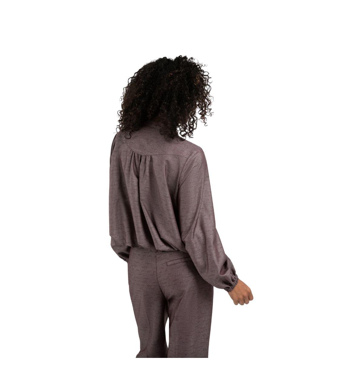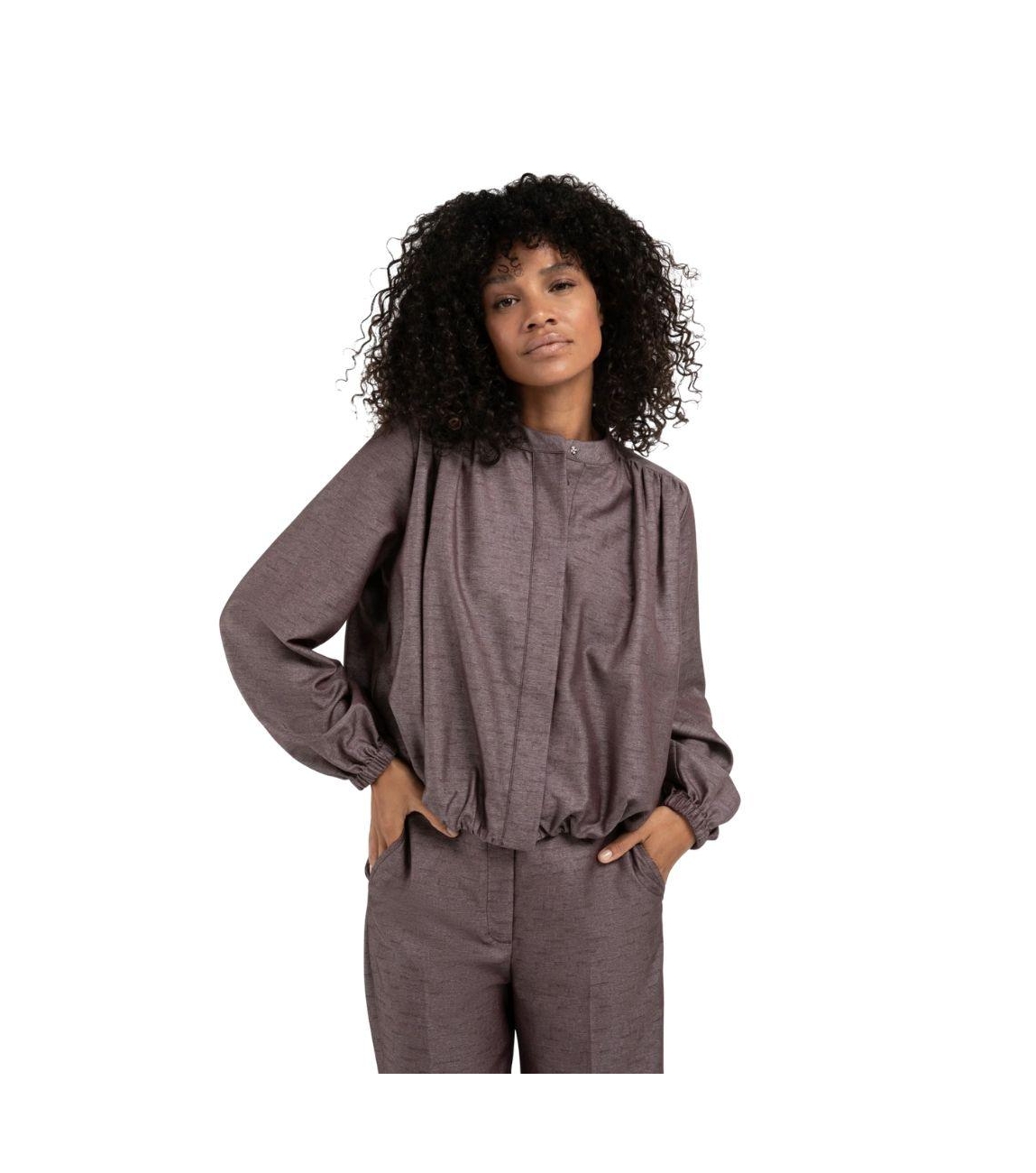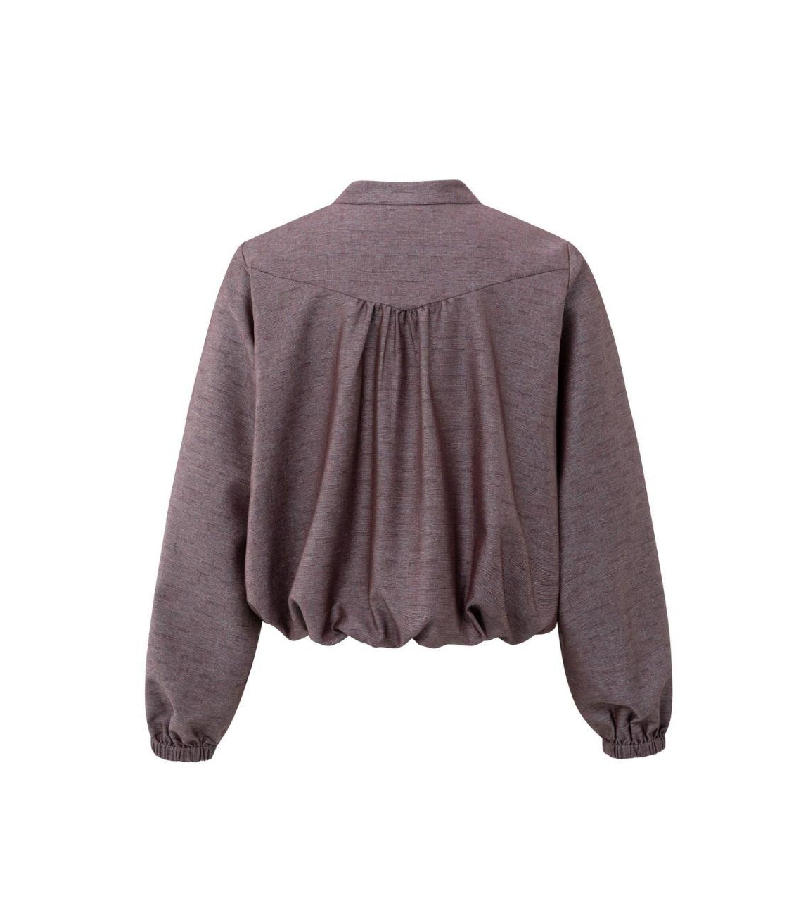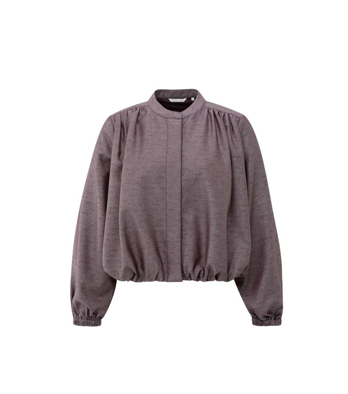Yaya blouse jacket 01-201194-511. Dit ballonvormig model is voorzien van een ronde hals en heeft lange mouwen. Deze bordeauxrode blouse jacket van Yaya sluit door middel van knopen en beschikt over elastische boorden.