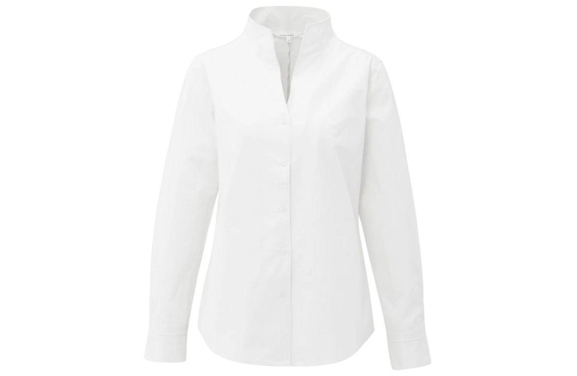 Yaya blouse 01-201181-510 00000. Dit rechtvallende model heeft een opstaande kraag met V-inkeping en lange mouwen. Deze off-white blouse van Yaya sluit aan de voorzijde door middel van knopen en heeft afgewerkte manchetten.