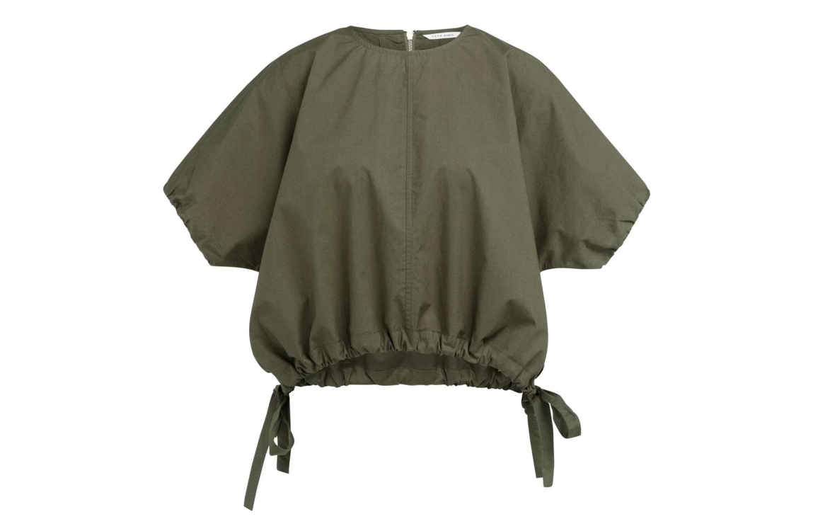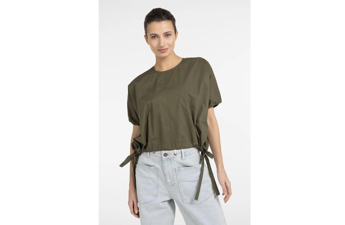 Yaya Boxy top with adjustable waist 99065 Army green. Dit wijdvallende model is voorzien van een ronde hals en heeft korte pofmouwen. Deze groene top van Yaya heeft een kortere lengte en is aan de onderzijde voorzien van verstelbare strikkoorden, waarmee je de taille subtiel kunt aanpassen. Dit model heeft een ritssluiting op de rug.