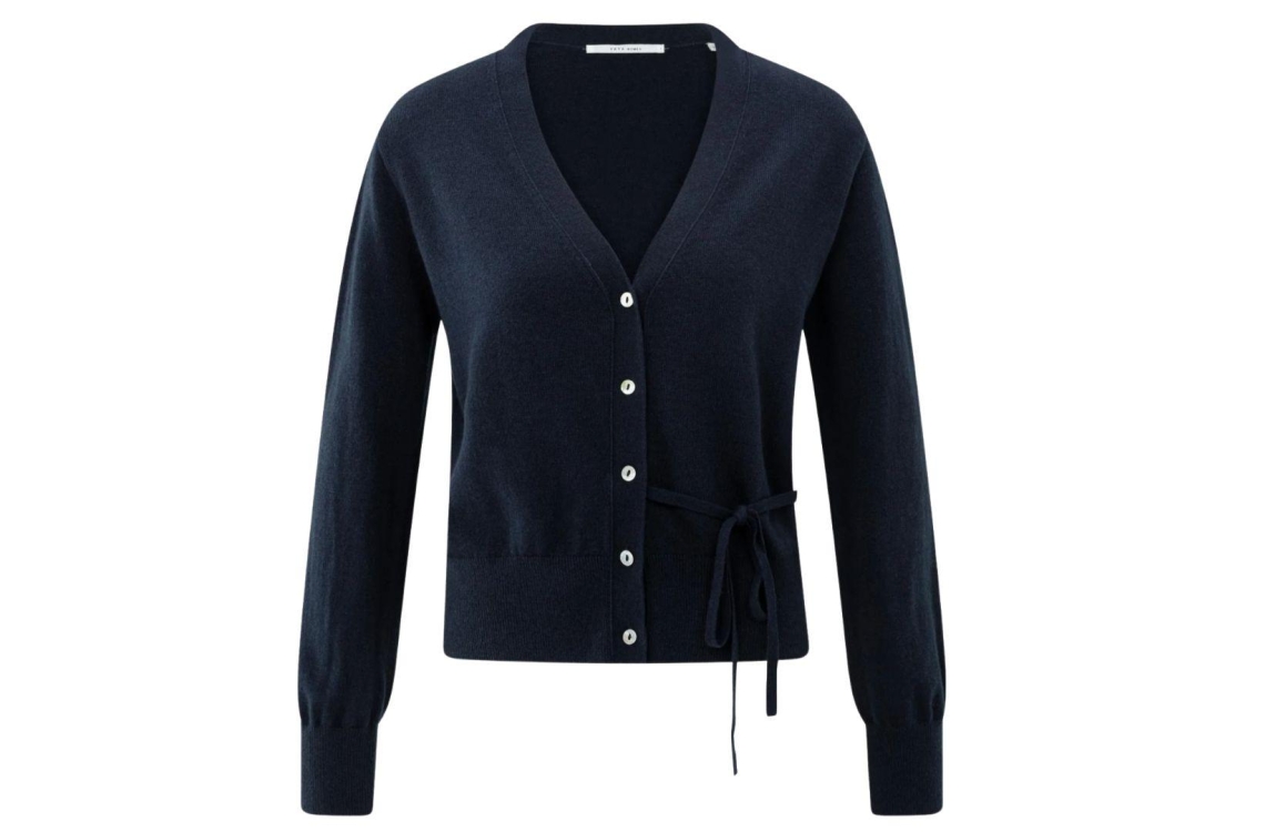 YAYA cardigan 01-010122-508. Dit rechtvallende model heeft een diepe V-hals en lange mouwen. Deze donkerblauwe cardigan van YAYA sluit door middel van knopen en is afgewerkt met een strikdetail in de taille. Het model is uitgevoerd in een zachte gebreide stof.
