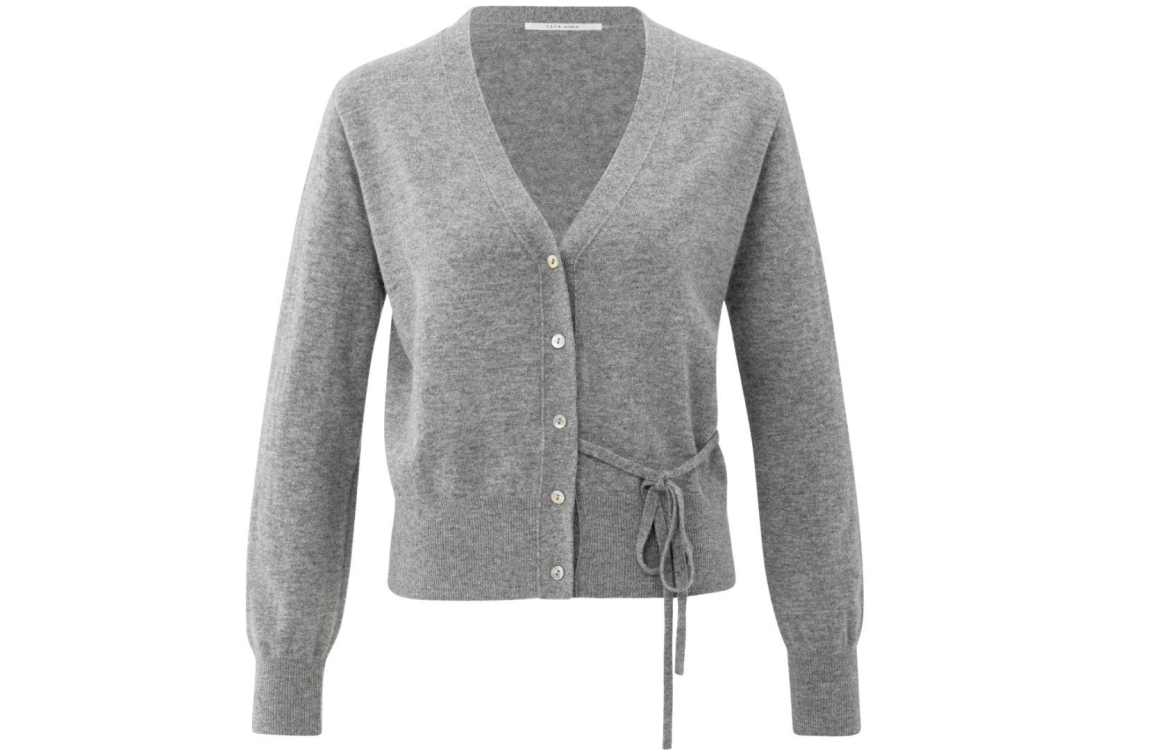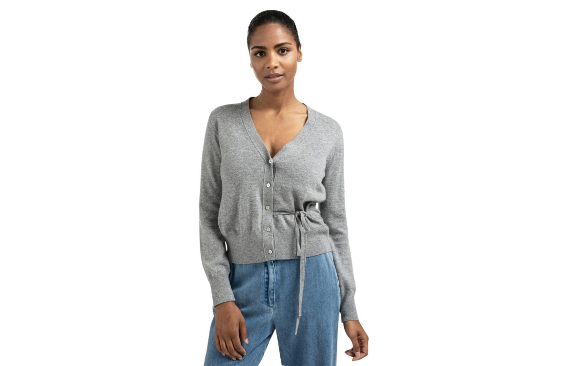 YAYA cardigan 01-010122-508. Dit rechtvallende model heeft een diepe V-hals en lange mouwen. Deze grijze cardigan van YAYA sluit door middel van knopen en is afgewerkt met een strikdetail in de taille. Het model is uitgevoerd in een zachte gebreide stof.