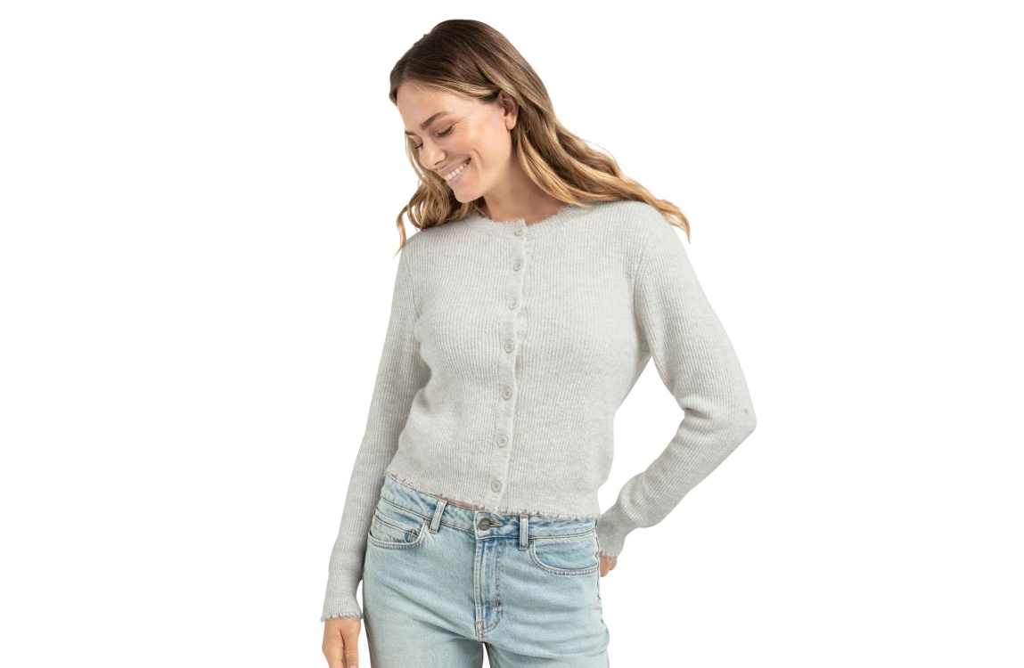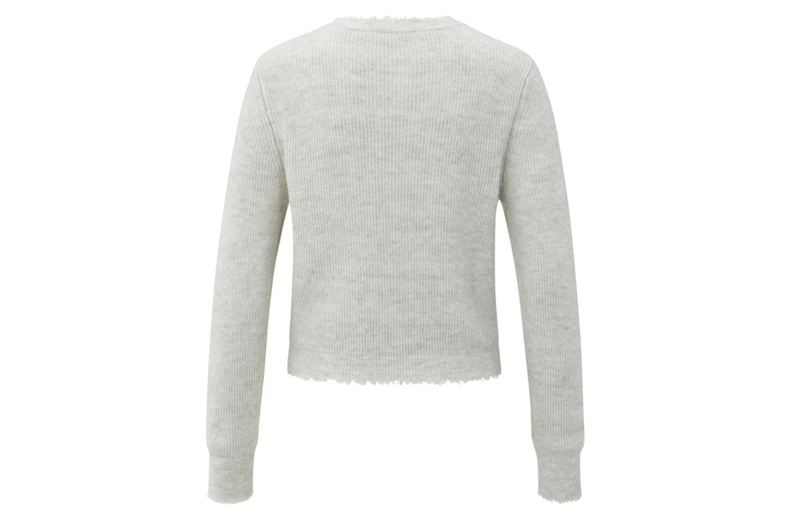 Yaya cardigan 01-010137-510 990312. Dit rechtvallende model heeft een ronde halslijn en lange mouwen. Deze lichtgrijze cardigan sluit aan de voorzijde door middel van knopen en is all-over uitgevoerd in ribgebreide kwaliteit. Het model is gedetailleerd met ruffles bij de boorden.