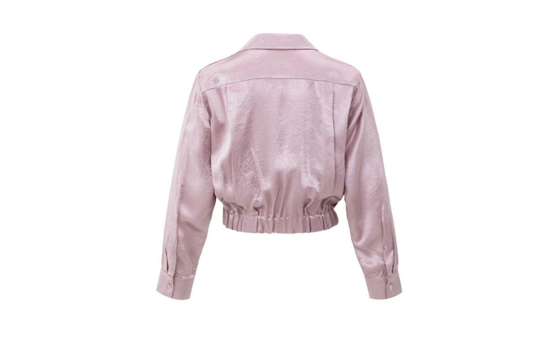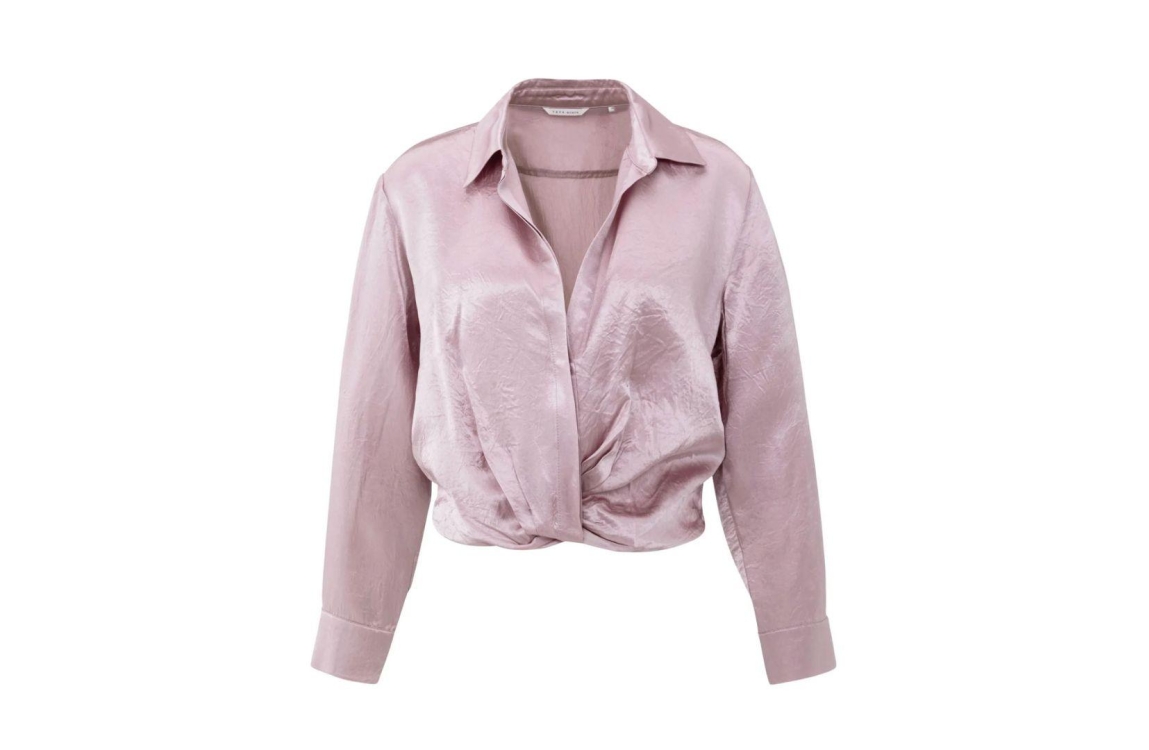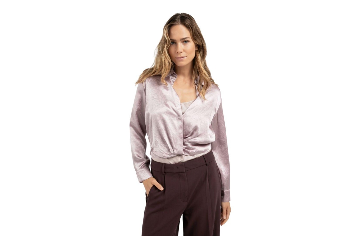 Yaya blouse 01-201186-511. Dit cropped model sluit door middel van een kraag en heeft lange mouwen. Deze roze satijnen look and feel blouse van Yaya sluit door middel van knopen en is afgewerkt met draperie.