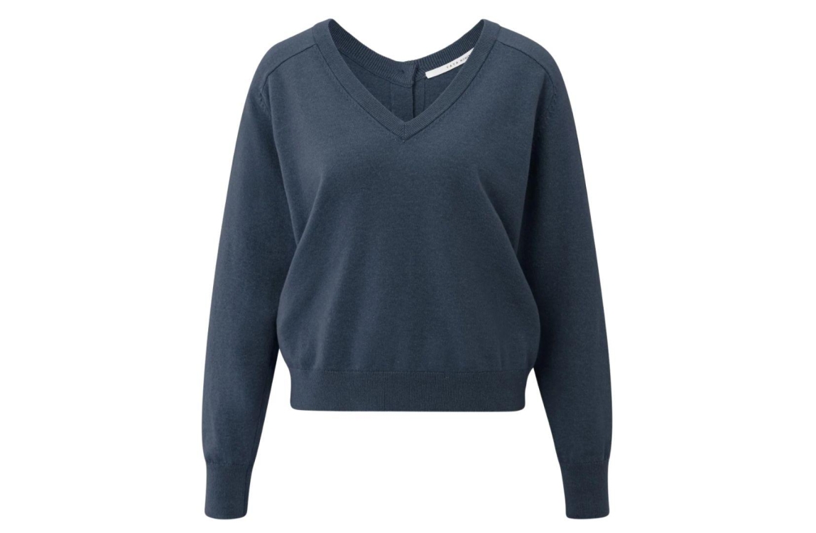 YAYA sweater 01-000494-508. Dit soepelvallende model heeft een V-hals aan zowel de voor- als achterzijde en lange mouwen. Deze blauwe sweater van YAYA is gedetailleerd met knoopsluitingen op de rug en is afgewerkt met brede, ribgebreide boorden.